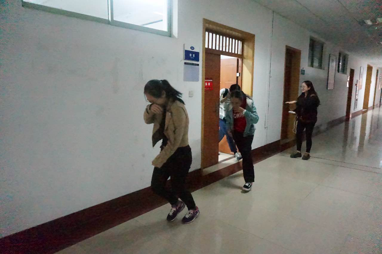 中午13:00,辅导员通过PPT介绍并讲解消防安全重要知识,带领同学们观看火灾现场视频,并组织讨论在校园、教室、寝室如何预防火灾和自救。14:30-15:00,分两批次开展了消防疏散逃生演练。在生活部部长“演练开始”的指令下,全体与会员工立即停止手上动作,在部门负责人和现场安全引导员的指挥下,用毛巾、围巾等捂住口鼻快速有序地撤离到室外的空旷地带,以班级为单位集结并清点人数。演练现场秩序井然,达到预期的演练目的。