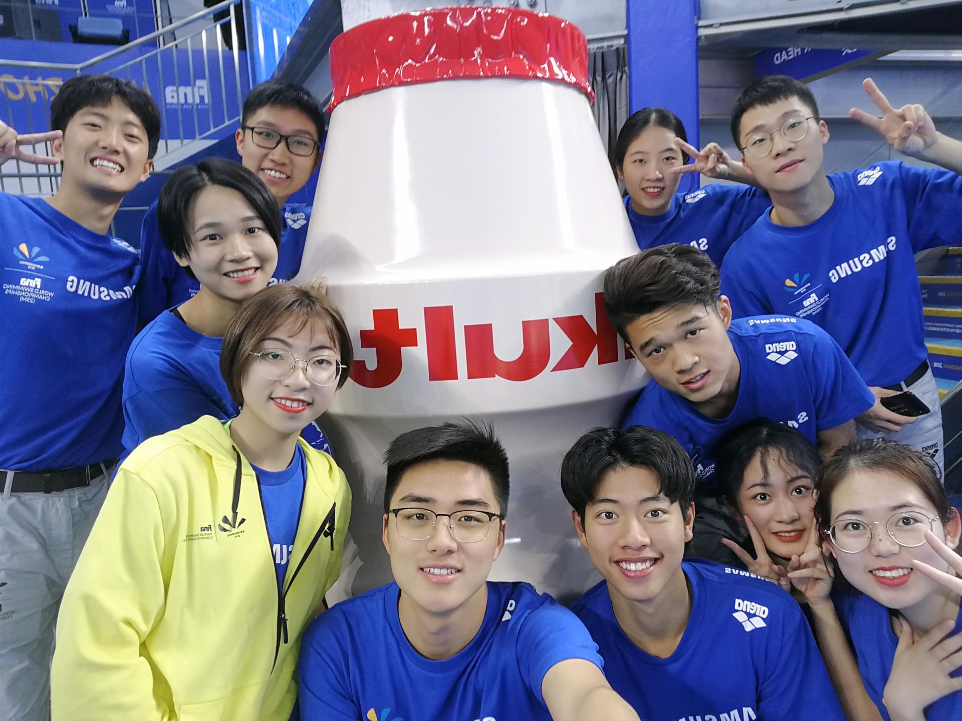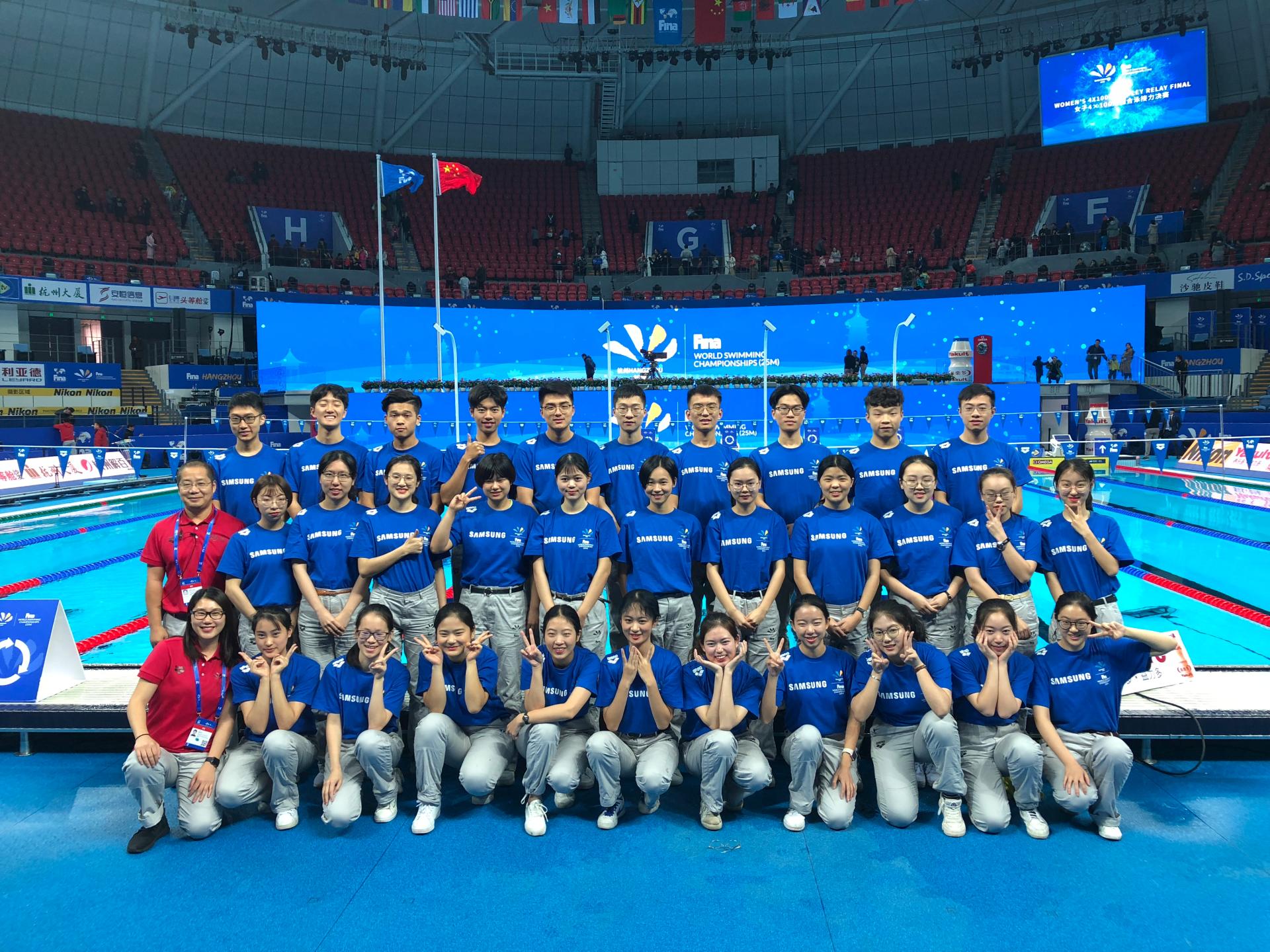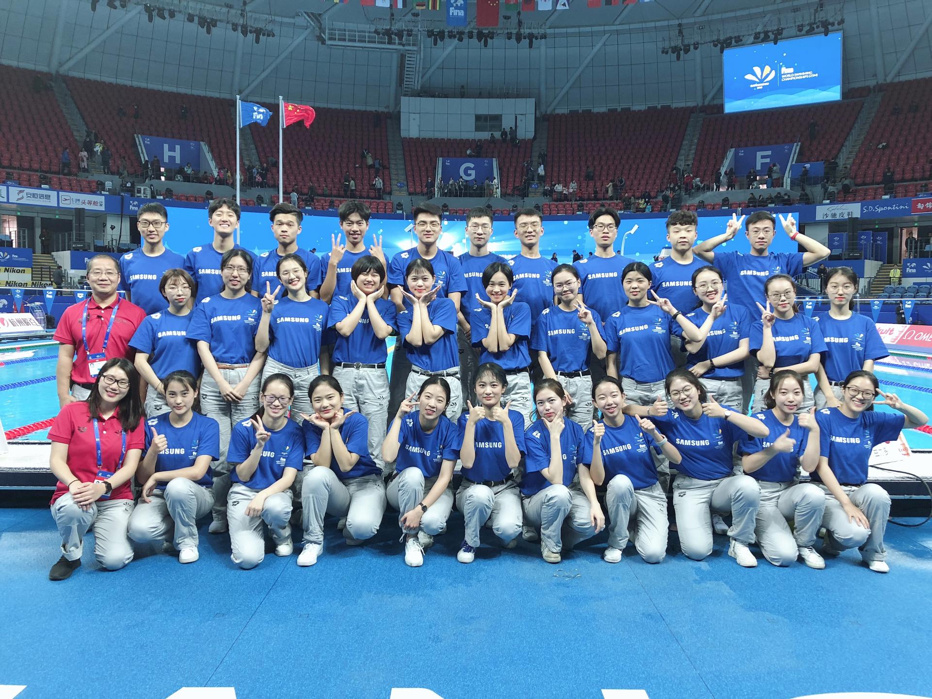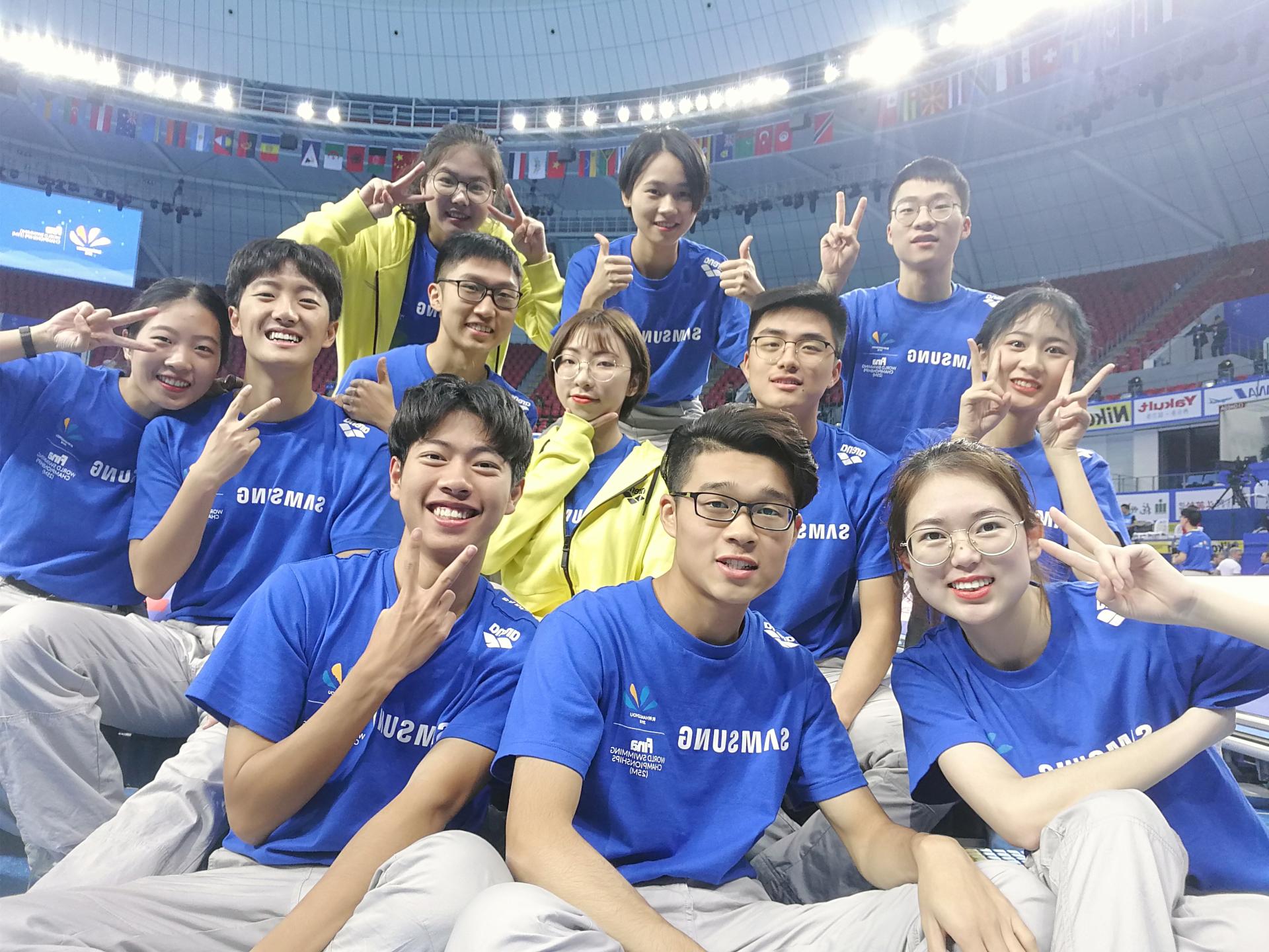 公司18级英语语言文学专业研究生常钰炫、颜婷、叶春杨、周慧、周俊子,16商务英语3班朱捷莹珂以及16英语2班舒景共7名同学参与到此次世游赛志愿者服务工作。在接受民族宗教禁忌、国家安全保密、突发应急、自我保护等专业知识的授课,以及严格的礼仪形象管理和团建体能培训之后,7名同学主要负责运动员场地及看台区域,引导各国运动员、教练员文明有序观看比赛,整理场上运动员衣物,分发成绩单、奖状等工作。