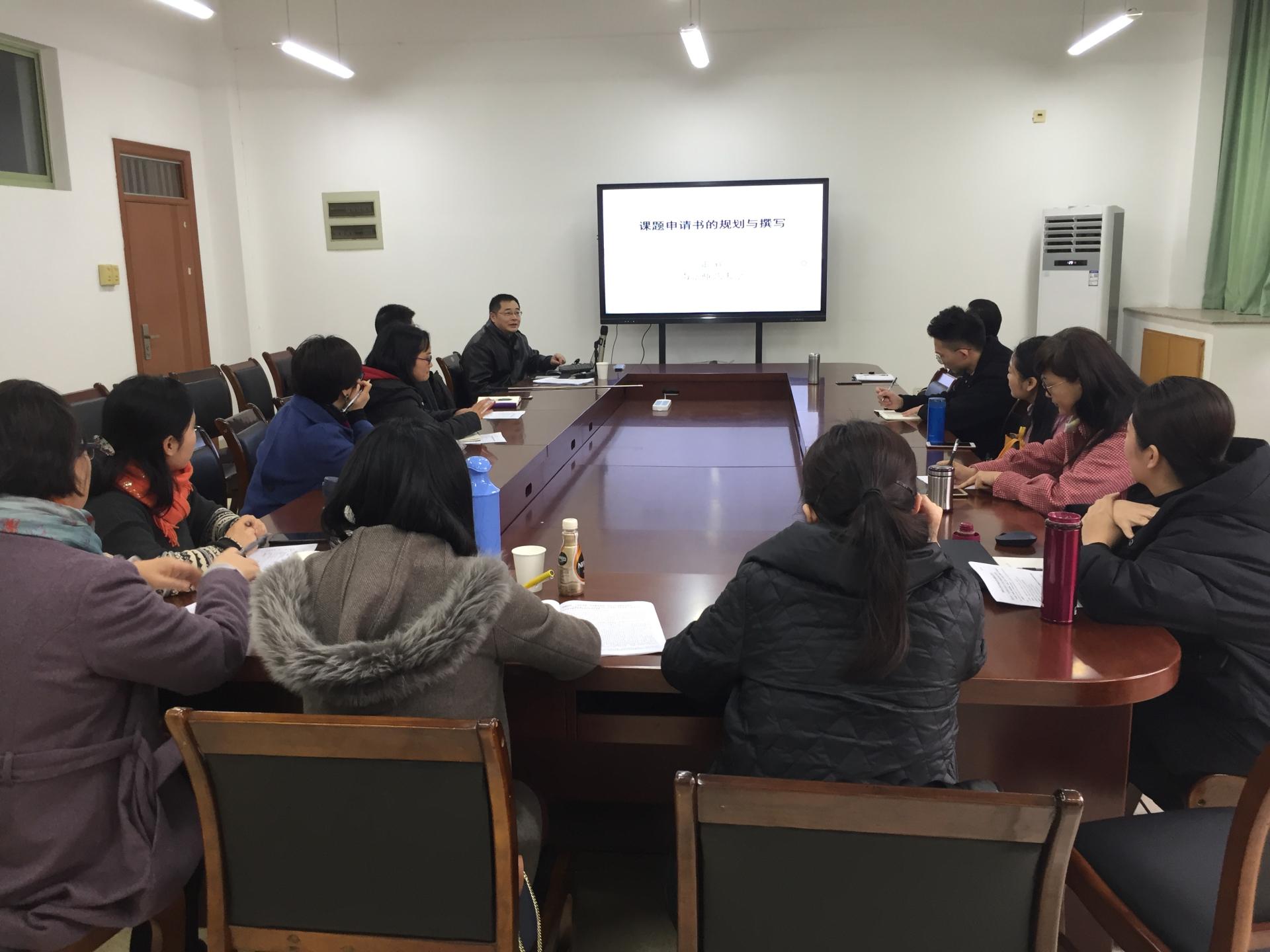 2018年12月19日下午,公司国家级课题申报辅导会在公司楼304会议室顺利开展, 南京师范大学张辉教授作为特邀专家做了题为“课题申请书的规划与撰写”专题辅导报告。会议由公司副经理邵斌教授主持,公司经理黎昌抱教授、副经理曹道根教授、部分老师参加了此次会议。