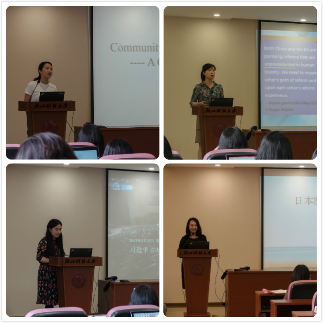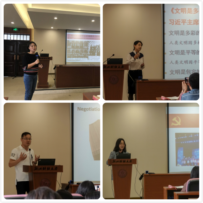 其中,杨晨音老师以《英语阅读》课程为例,从国际视角解读文学作品,讲述如何帮助员工树立正确的人生观、价值观和世界观。孔飞燕老师以《大学英语》课程为例,解析外交关系,在翻译实践中培养员工的爱国主义情怀。徐莎莎老师以《财经新闻听力》课程为例,解读中国智慧和中国方案。黄莹以《日本概况》课程为例,讲述鲁迅等文化名人在日本求学的经历;张萌老师以《法语二外》课程为例,讲述中共早期领导人在法国勤工俭学的故事,教育员工珍惜时光,为国家富强勤奋学习。张迅老师以《英美文化》课程为例,立足中华优秀文化,分析中西方文化差异。潘江峰老师以《国际商务谈判》课程为例,从周恩来外交谈判到中美贸易谈判,结合传统文化分析中外商务谈判的不同。张莲老师结合公司“党建+文化”主题党日活动,探讨外语教师的使命和担当。