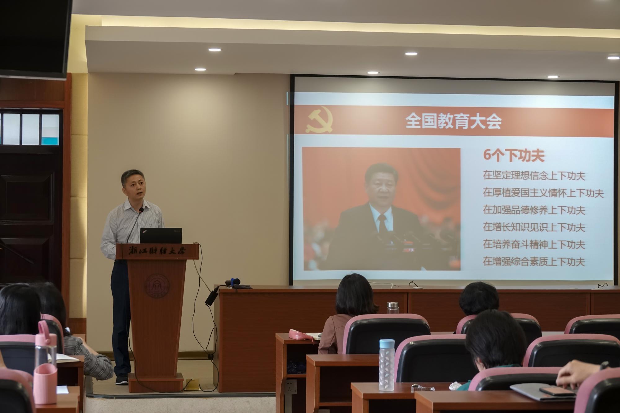 首先,章汝雯书记结合习近平总书记在全国高校思想政治工作会议上的重要讲话精神,要求全体教师深入发掘外语课程的思想政治理论教育资源,充分发挥课堂教学在育人中主渠道作用,落实所有教师育人职责。