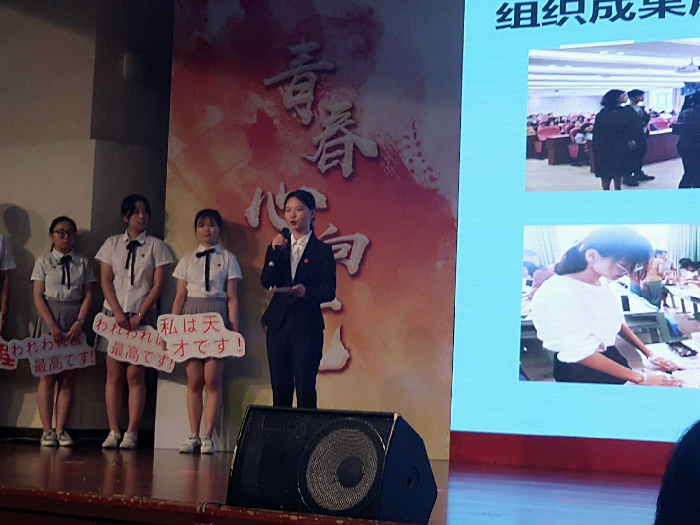 各候选支部通过朗诵、合唱、歌舞、情景剧等形式,展现了团支部的特色文化和青春活力。公司17日语1班团支部围绕支部建设,从思想引领、学业成就、实践锻炼、公益实践、国际交流等方面进行了精彩的现场展示,日语系方小赟老师到场为同学们助力。经公司评审组会评,17日语1班团支部在13个全校候选支部中脱颖而出,以总分第四的佳绩荣获2019年校“十佳团支部”荣誉称号。