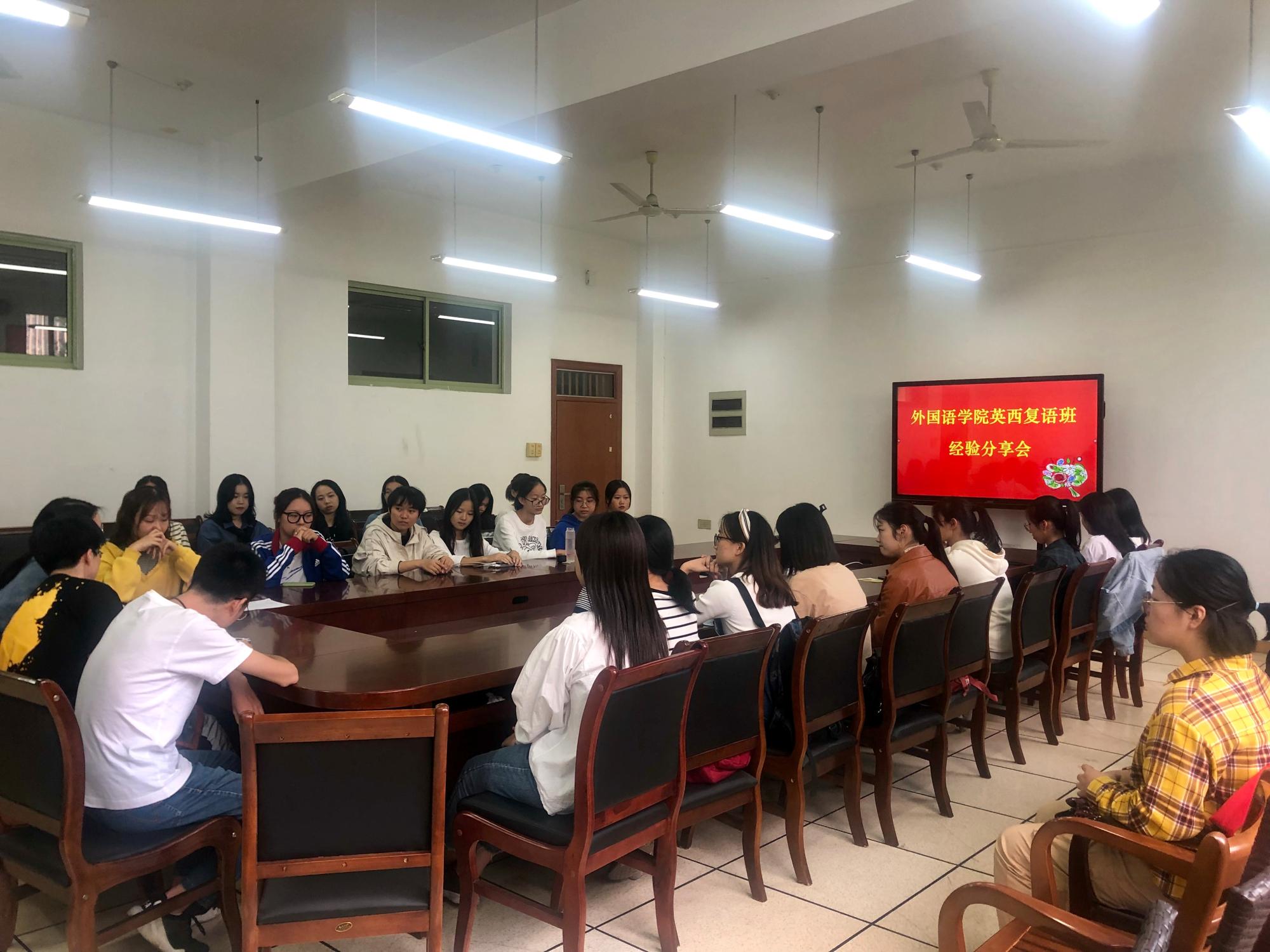 10月15日下午3:00,英西复语特色班学习交流会在304会议室召开。英语系副主任徐莎莎老师,办公室主任兼班主任张莲老师、学办主任陈思佳老师、西班牙语姬宇鹏老师和陈婉玉老师以及17级、18级英西复语特色班的同学们参加本次交流会。