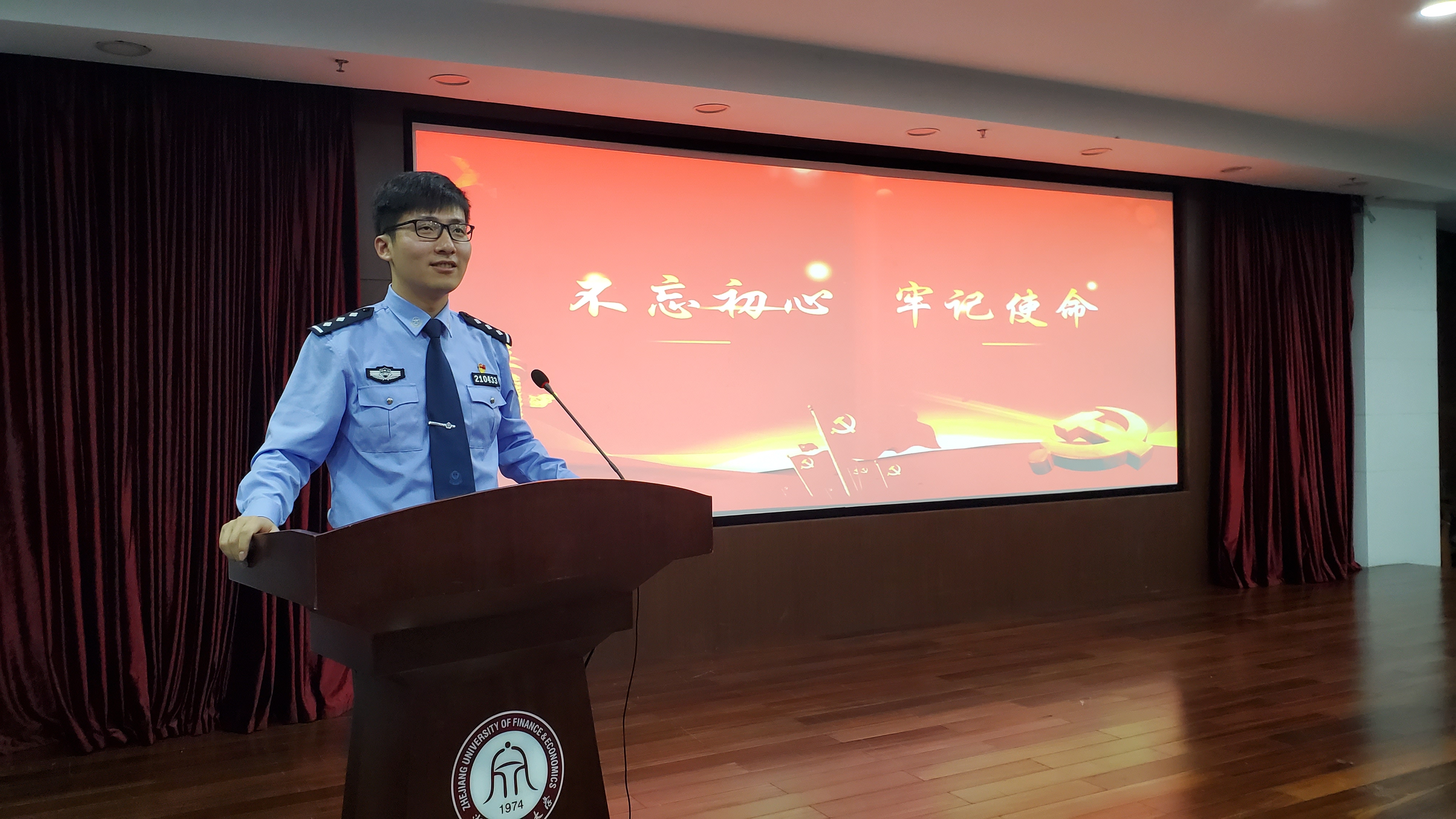 马義超员工现为杭州出入境边防检查站执勤业务一科党支部书记。他与同学们讲述了参加维和的经历,2016年1月通过联合国甄选,担任中国第四支驻利比里亚维和警察防暴队指挥中心后勤联络官,于2016年3月进驻利比里亚首都蒙罗维亚;和队友们一起,克服困难,圆满完成各项任务,向世界展示“中国形象”。他以“初心”、“使命”为关键词,与同学们分享自己工作的体会和感悟,希望学弟学妹们能够秉承“进德修业,与时偕行”的校训,以党员标准严格要求自己,珍惜大学时光,练好本领,为母校增光添彩。