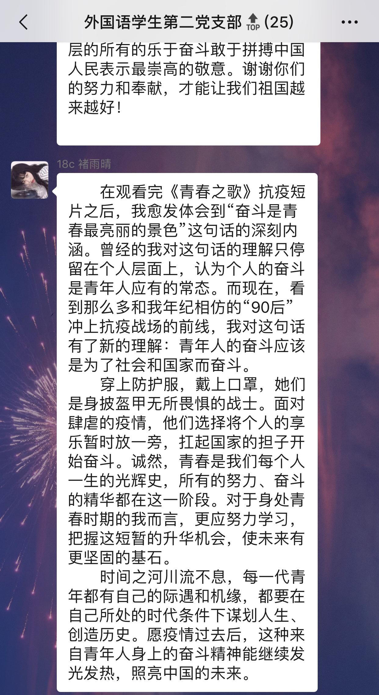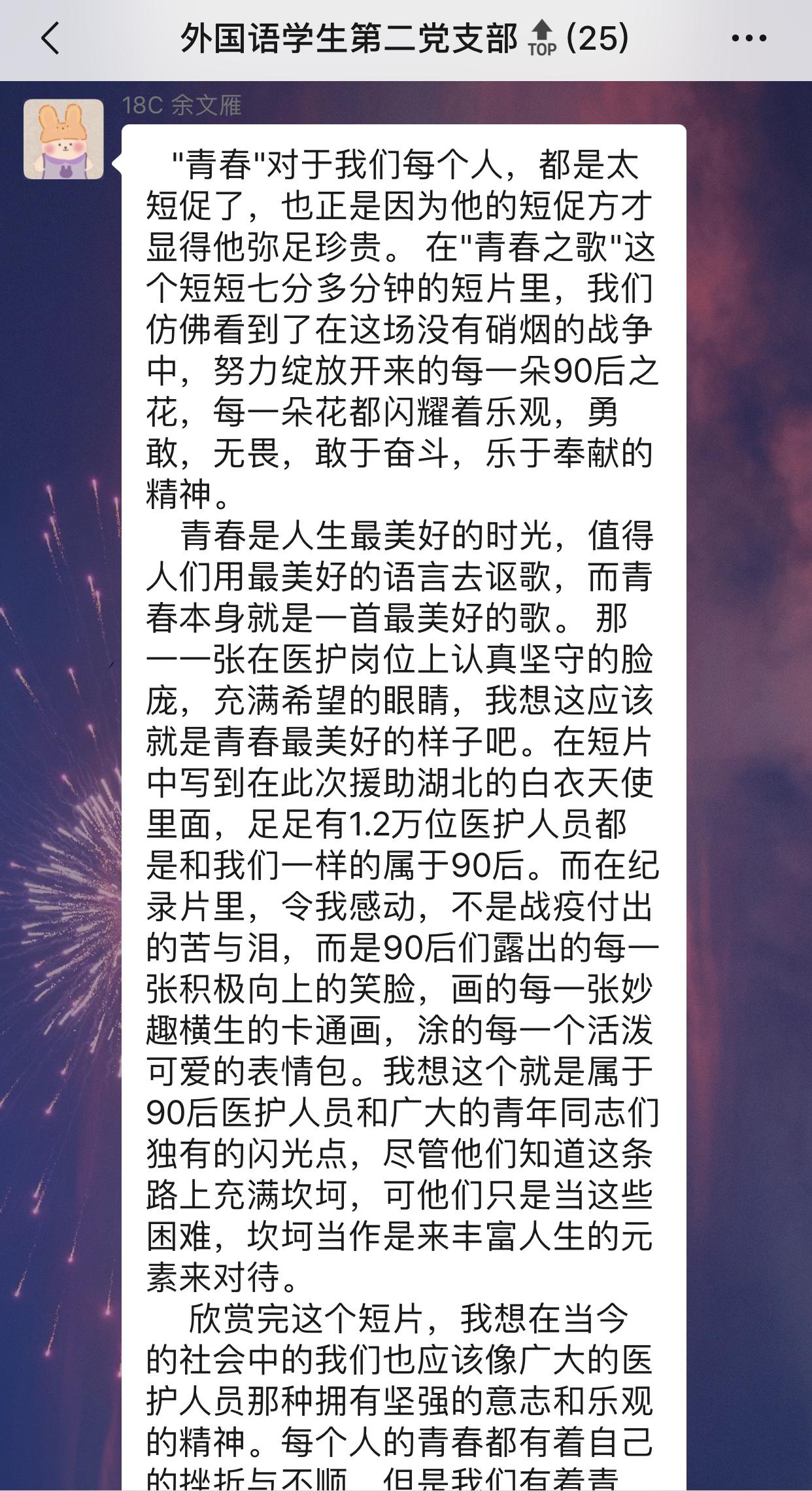 全体党员通过观看微电影《青春之歌》,对各省援鄂医疗队伍中“90后”甚至是“00后”勇担使命的先进故事有了更为直观和深入地了解,奋斗在抗疫前线的身影也深深鼓舞了广大党员同志,大家纷纷表示会牢记习近平总书记的号召,在奋斗路上将不惧风雨、勇挑重担,让青春在党和人民最需要的地方绽放绚丽之花。