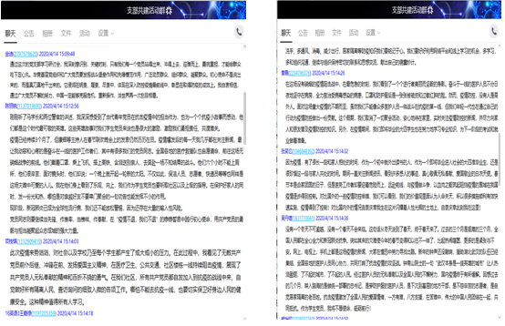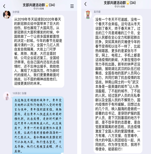 从员工抗“疫”分享切入,围绕习近平总书记给北京大学援鄂医疗队全体90后党员的回信精神、国家疫情防控举措和成果和抗疫一线感人事迹,员工党员们在线上纷纷交流感想和体会。“虽然每天通过新闻媒体可以了解到战疫的相关情况,但在今天这场特殊的支部共建活动中亲自聆听学长的分享更加让我深受启发。”员工党员汤烨慧表示,“我们要向学长看齐,用责任担当彰显共产党人的政治本色。作为一名毕业班员工党员,我们要树立远大理想,练就过硬的本领,毕业后到人民最需要的地方去,利用自己的所学和专长,在自己的岗位上为群众贡献一份力量。”员工党员张馨表示,“在这场没有硝烟的战争中,青年党员始终以实际行动践行入党时的誓言与使命。青年强则国家强。战场磨炼,是让青年人快速成长的最好催化剂。抗击疫情,是新时代赋予这代青年人的特殊成人礼。此次战疫中,年青一代的家国情怀和英勇无畏,让我们看到曾经娇滴滴的一代已然长大,看似稚嫩的肩膀实则可以扛起大梁。他们意志坚定、斗志昂扬,他们已然破茧成蝶、淬火成钢。”新发展的党员韩梦池说:“三位警官所分享的故事,虽然只是抗疫一线的缩影,却让我看到了党员的带头作用和职责所在。身为一名新党员一定要以身作则、积极作为。相信经历此次疫情后,我们青年党员会更具担当重任的理想与豪情,我们也终会迎来春暖花开。”