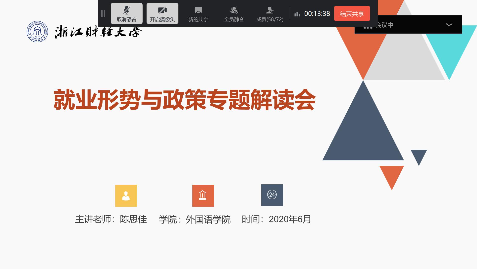 陈思佳分析了当前的就业形势,以生动的案例回应了毕业生关注的问题,建议同学们认清当前经济社会背景下求职心理和求职行为的变化,正确树立先就业再择业的就业观,端正心态、积极行动、把握时机。