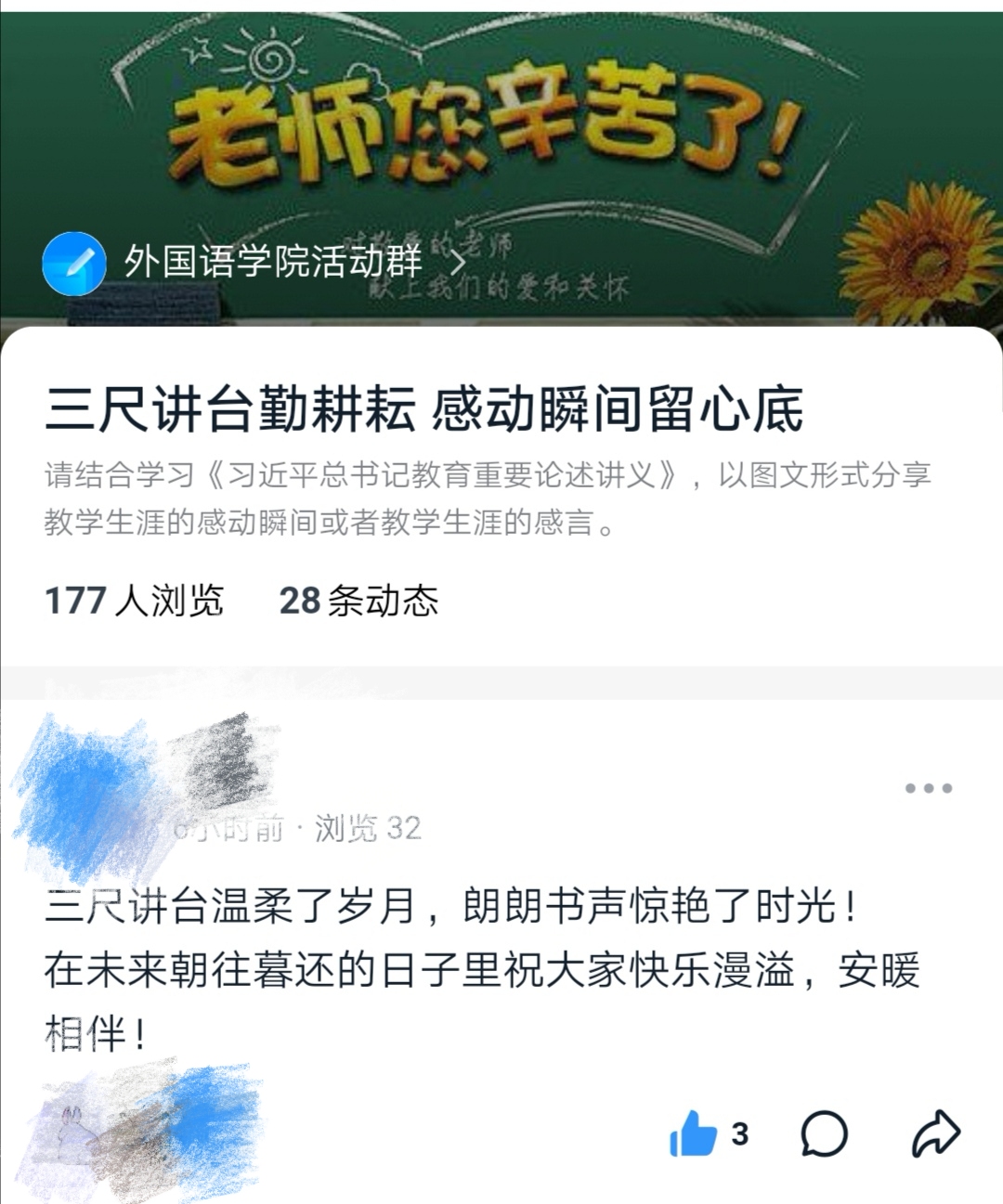 活动中,公司教职员工认真学习了《习近平总书记教育重要论述讲义》,相互交流了学习心得,并以图文并茂的方式分享了自己在教学岗位上奋斗工作的深切体会和感动瞬间。三十年以上教龄的资深教师回顾了自己在教员工涯中的点点滴滴,奋战在教学一线的骨干教师讲述了教学工作中的收获与成长,刚进校的年轻教师表达了在三尺讲台实现自我的强烈愿望……