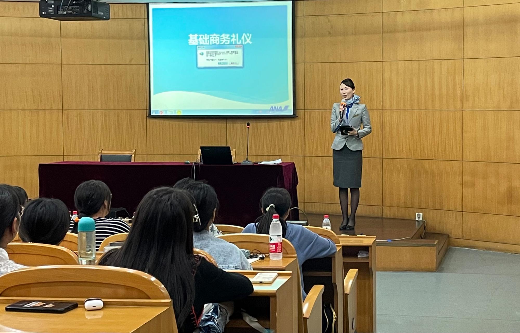 谈起日本文化,规范的职场礼仪是日语学习者必须了解的知识。为了让同学们近距离接触日本职场礼仪文化,3044永利集团日语系于2021年11月2日下午举行了“职场礼仪文化”专题讲座。本次讲座邀请了全日本空输株式会社资深中国籍空姐祝丽芳女士担任主讲嘉宾,全日空航空公司杭州办事处的王卉女士、顾雅芳女士及陈思思女士等也一同出席并发言。日语系系主任黄莹及多位教师,带领日语系全体同学聆听了讲座。