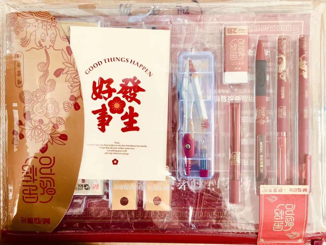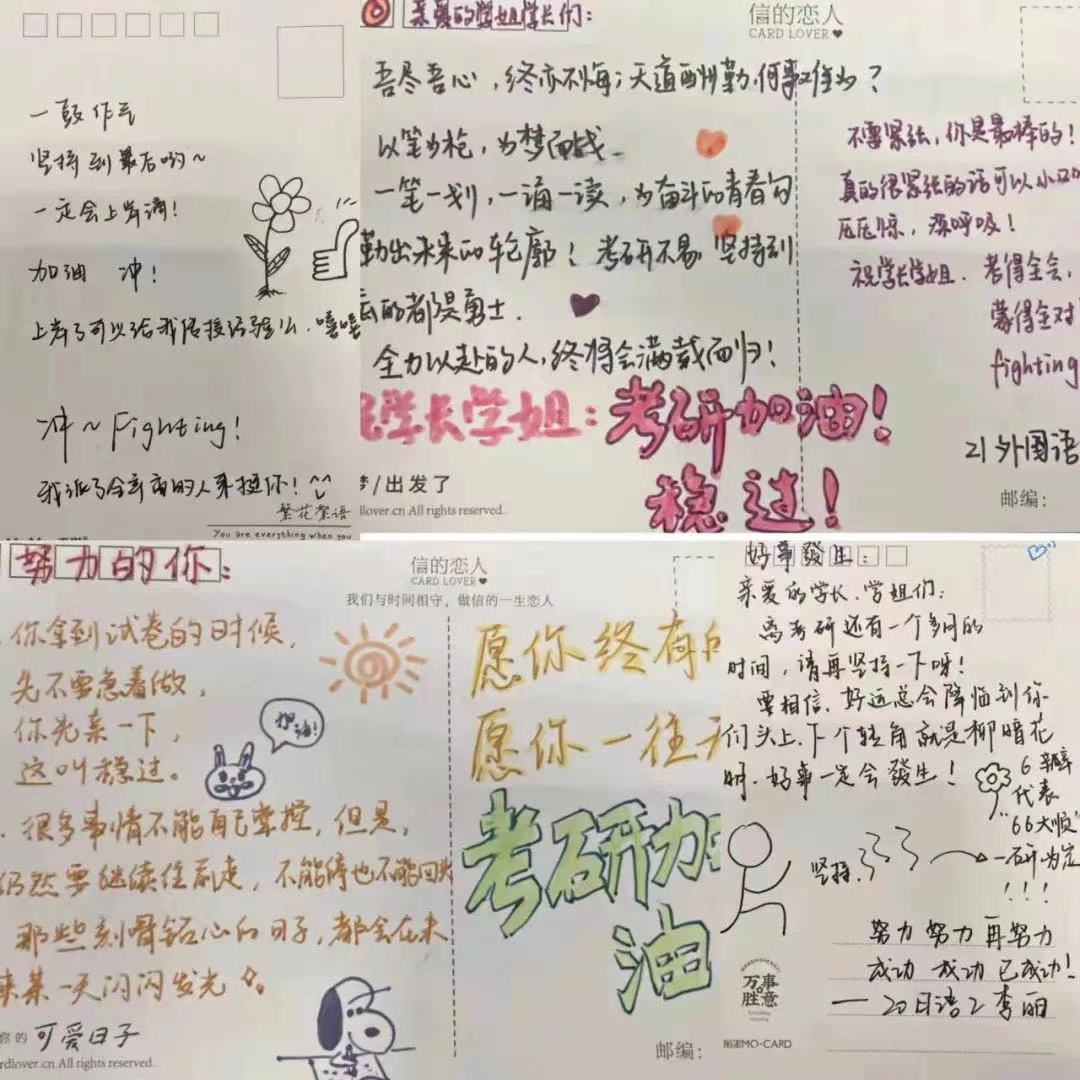 最后,公司领导为考研员工逐一发放慰问礼品。为考研学子准备的牛奶,寓意牛气冲天,万事顺意;考试文具套装,寓意蟾宫折桂,金榜题名。还有来自学弟学妹们的祝福明信片,承载着学弟学妹们语你同行,逐梦远航的心意。
