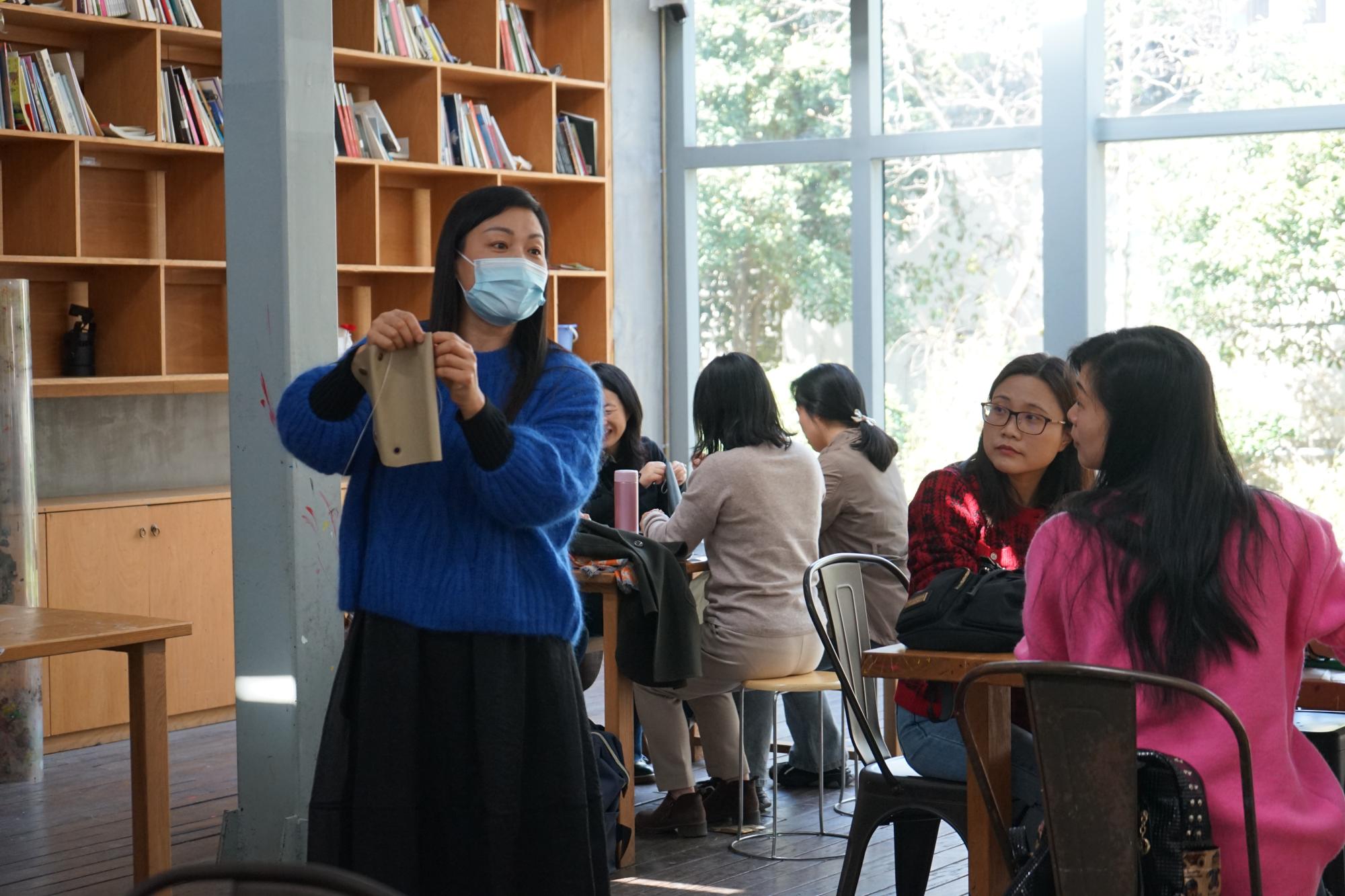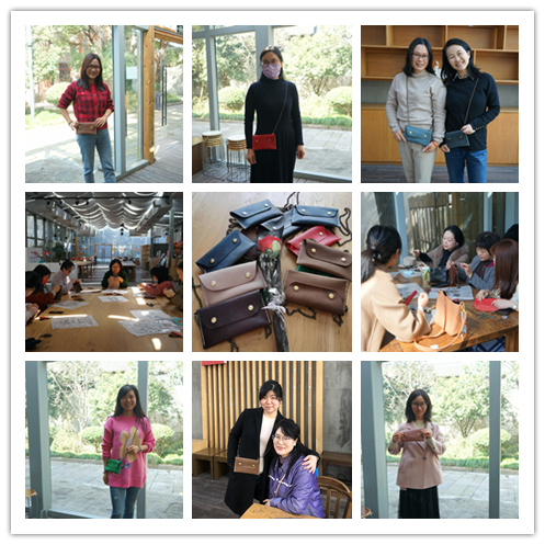 在活态馆老师的指导示范下,老师们从选取款式到裁剪缝制,享受一针一线的手作乐趣,感受皮革柔软扎实的触感,用心制作一件独一无二的皮具。经过一番努力,老师们DIY的手工皮包陆续制作完成,大家纷纷与作品合影,整个活动现场充满欢声笑语。