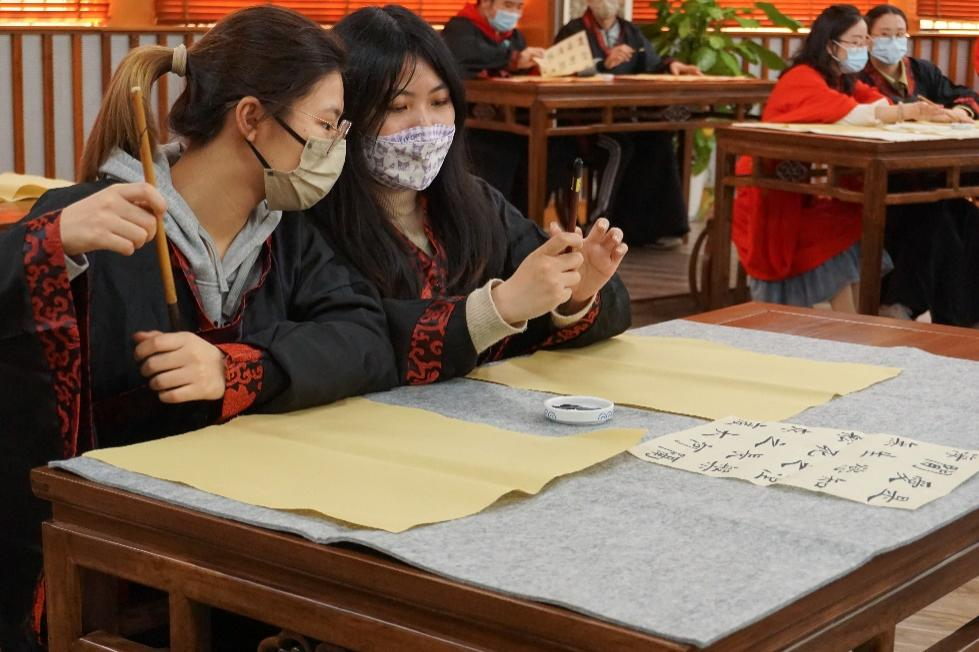 日语中的汉字起源于中国。活动现场,移动课堂主讲教师苏浩博士,向师生们展示并介绍了《四库全书》、《文章轨范评林》、《艺苑名言》等汉文古籍。员工们换上汉服,挥毫泼墨,体验书法之道及中华传统文化礼仪。