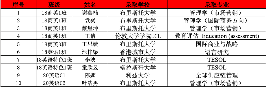 在全院师生的共同努力下,公司2022年考研(博)、出国(境)升学成绩更上一层楼。截止2022年6月底,在2022届毕业生中,共有54名毕业生被国内外各大高校录取。43名本科毕业生、1名硕士毕业生被国内高校录取,其中包含北京外国语大学、上海外国语大学、大连理工大学、苏州大学、湖南师范大学、对外经贸大学等“双一流”建设高校。10名毕业生被国(境)外高校录取,其中包括伦敦大学公司UCL、英国布里斯托大学等知名高校。