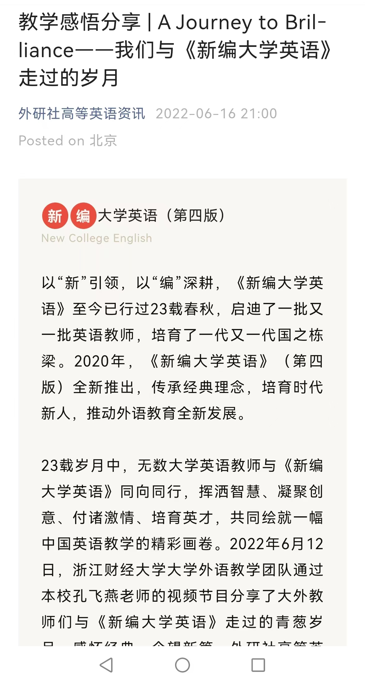近日,外语教学与研究出版社公众号平台“外研社高等英语资讯”,专门推送了公司大学外语教学部教学宣传视频作品《我们与<新编大学英语>走过的岁月》,感怀经典教材,企望新版教材,以“新”引领,以“编”深耕。