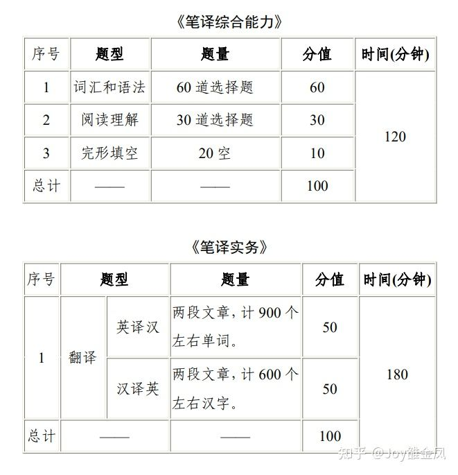 2、实务:英译汉,两段文章(计900个左右单词)50分;英译汉,两段文章(计600个左右汉字)50分。总分100分,总时间180分。