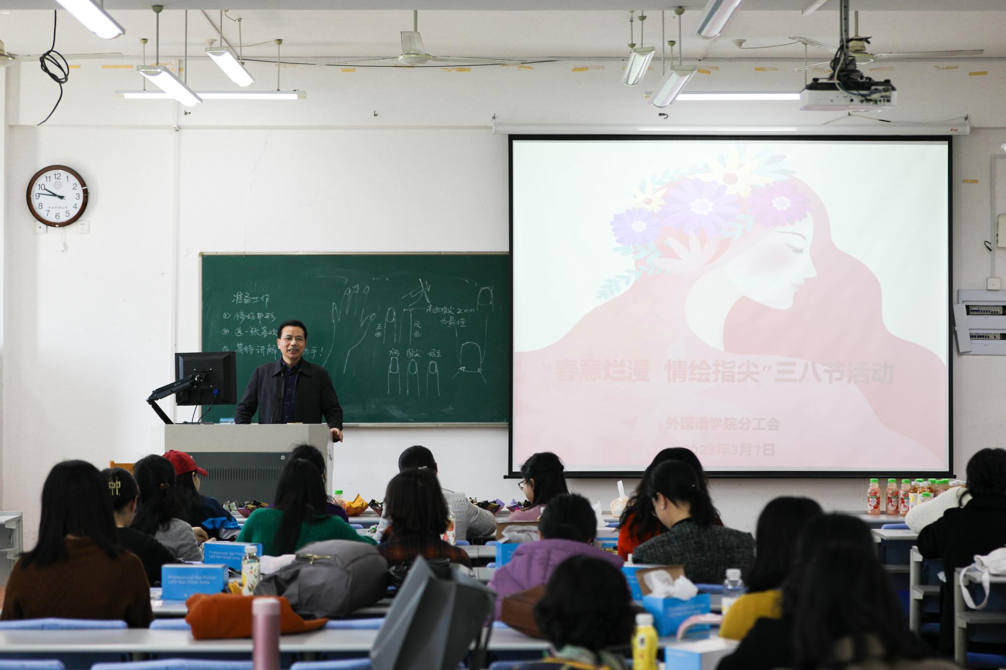 活动伊始,黎昌抱经理致辞,向女教职工送上了节日的祝福和关怀,感谢她们对公司的辛勤付出,以高度的责任心和敬业情操,展示了“巾帼不让须眉”的风采。接着,日语系柯克雷老师从基础理论知识、认识各类美甲工具及其技巧等方面进行讲解,特别强调了在日常生活中应该如何正确修甲、护甲。老师们现场化身“美甲师”,从打磨甲形、磨平边缘、黏上指甲贴、涂上护理油到照光等步骤进行了亲身实践。