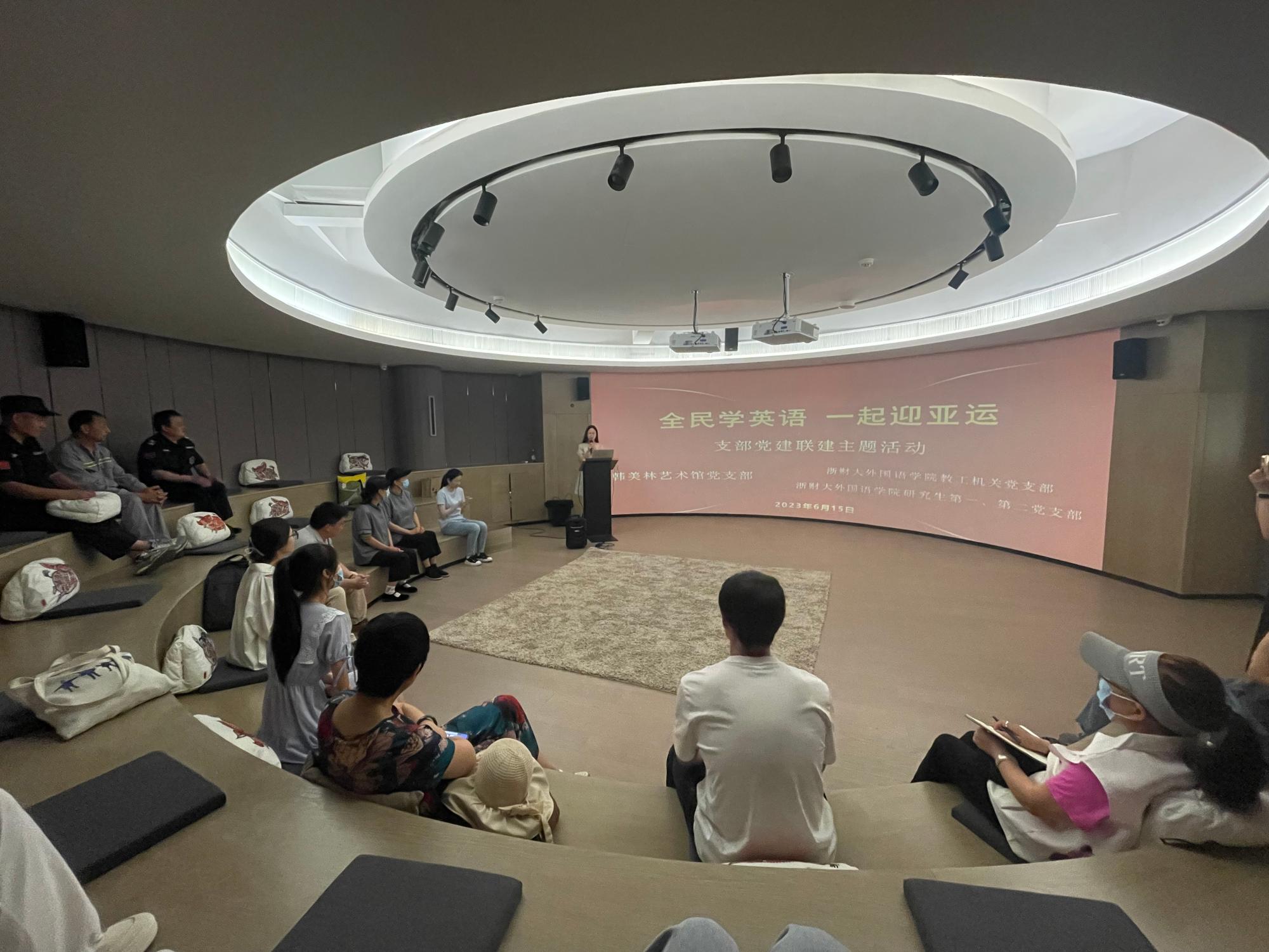 6月15日,正值亚运会倒计时100天之际,为进一步促进中外文化交流,,助力讲好杭州亚运故事,推广中国形象。公司教工行政党支部带领研究生第一、第二党支部与韩美林艺术馆党支部开展“全民迎亚运,一起学英语”支部共建活动。