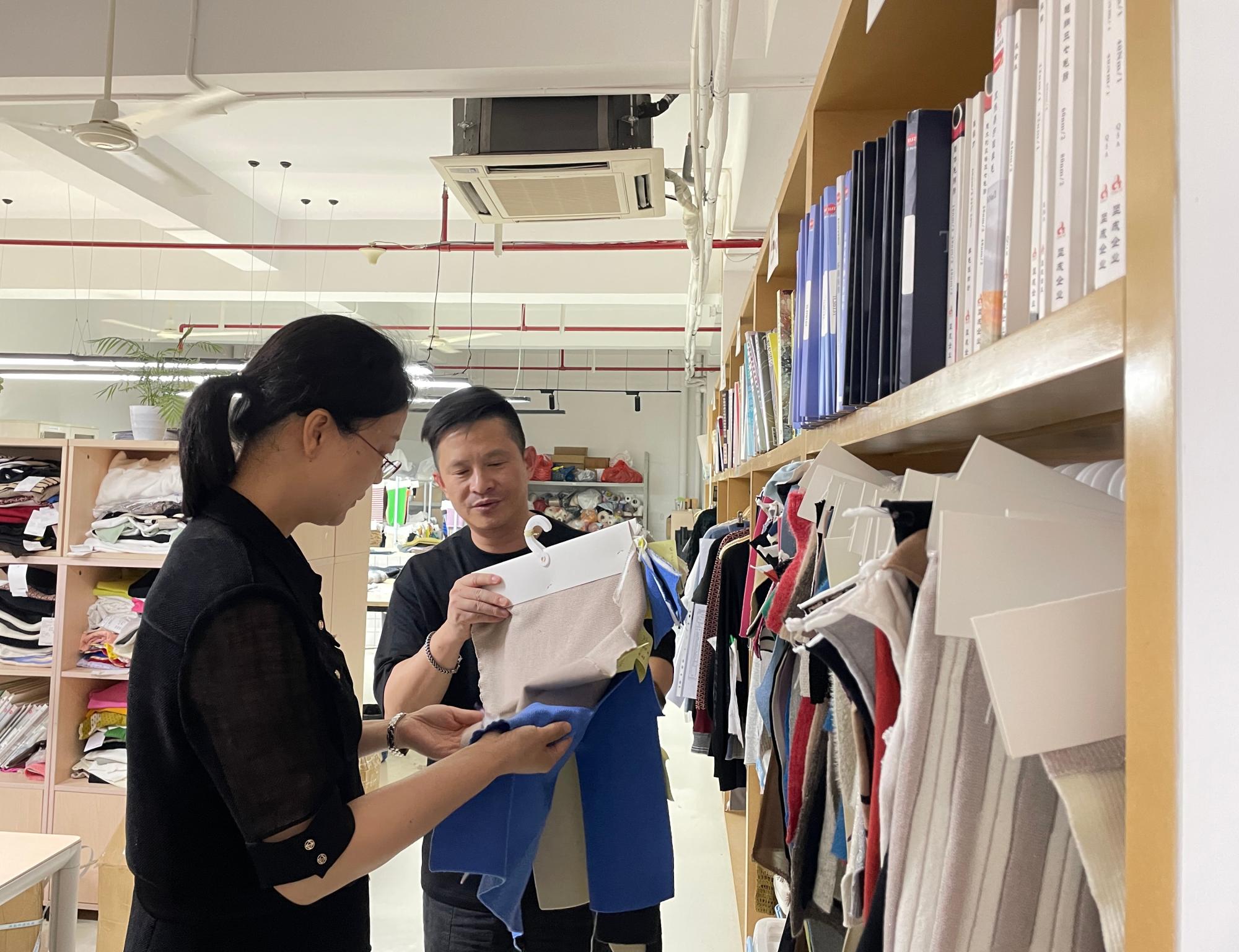 杭州悦和服装服饰有限公司董事长周曜、总经理助理邵佳琼、行政后勤经理陈科蔚热情接待了王景一行。在参观企业的过程中,董事长周曜讲解了针织衫从原料选取、生产定样、成品检验、产品出口以及销售的全链条周期。