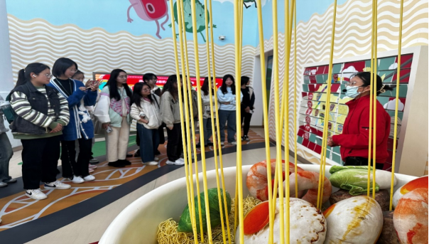 在企业老师的引导下,同学们来到红烧牛肉面的立体模型前,巨大的碗里放着牛肉、青菜、虾、鸡蛋等食材模型,旁边是一幅由各种食材所代表的的中国各省地图,仔细观察就能发现这上面的不同食材代表我国不同地域的口味偏好,也代表着康师傅因地制宜所进行的产品创新,红烧排骨、鲜虾鱼板、老坛酸菜等等,口味之多让同学们连连称奇。