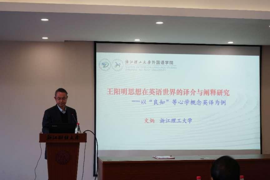 文炳教授以“王阳明思想在英语世界的译介与阐释研究”为题做了主旨发言。文教授分析了阳明心学相关术语英译的难点和分歧,如“良知”“知行合一”等,指出思想翻译的核心是概念词,关键在理解和表达。