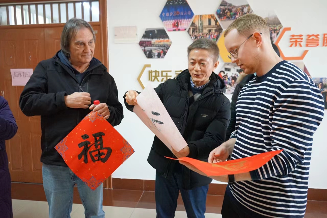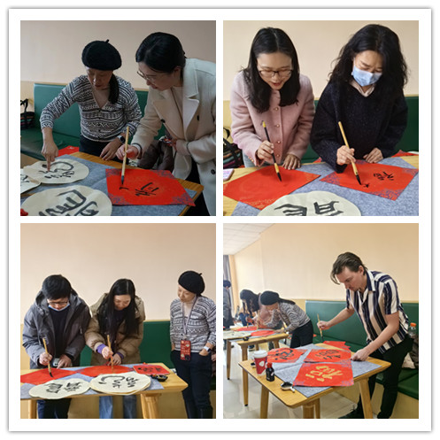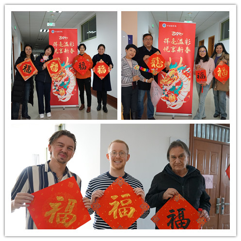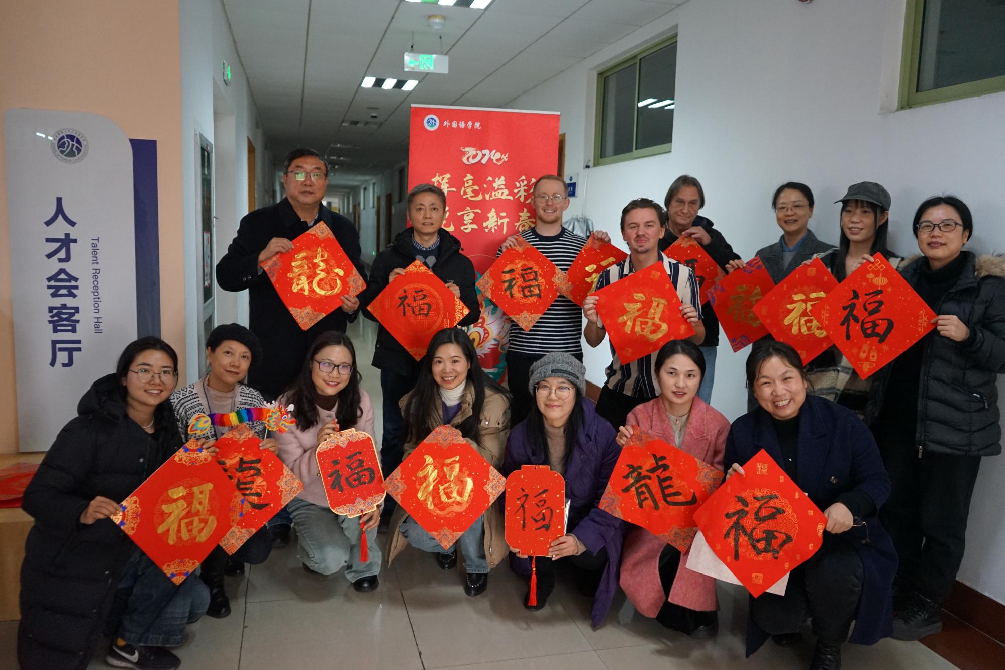 在公司楼三楼人才会客厅,公司分工会的教职员工们和外教老师摊开纸张、饱蘸墨汁、娴熟落笔、挥毫泼墨。在浓郁的墨香中,一张张吉祥喜庆的“福”字写出了老师们对迎接新春的喜悦,一幅幅行云流水的“龙”字描绘了老师们对美好生活的期待。活动现场,大家纷纷手持“福”字、中国结、龙年吉祥物、红鞭炮、福袋等合影留念,欢声笑语,热闹非凡。