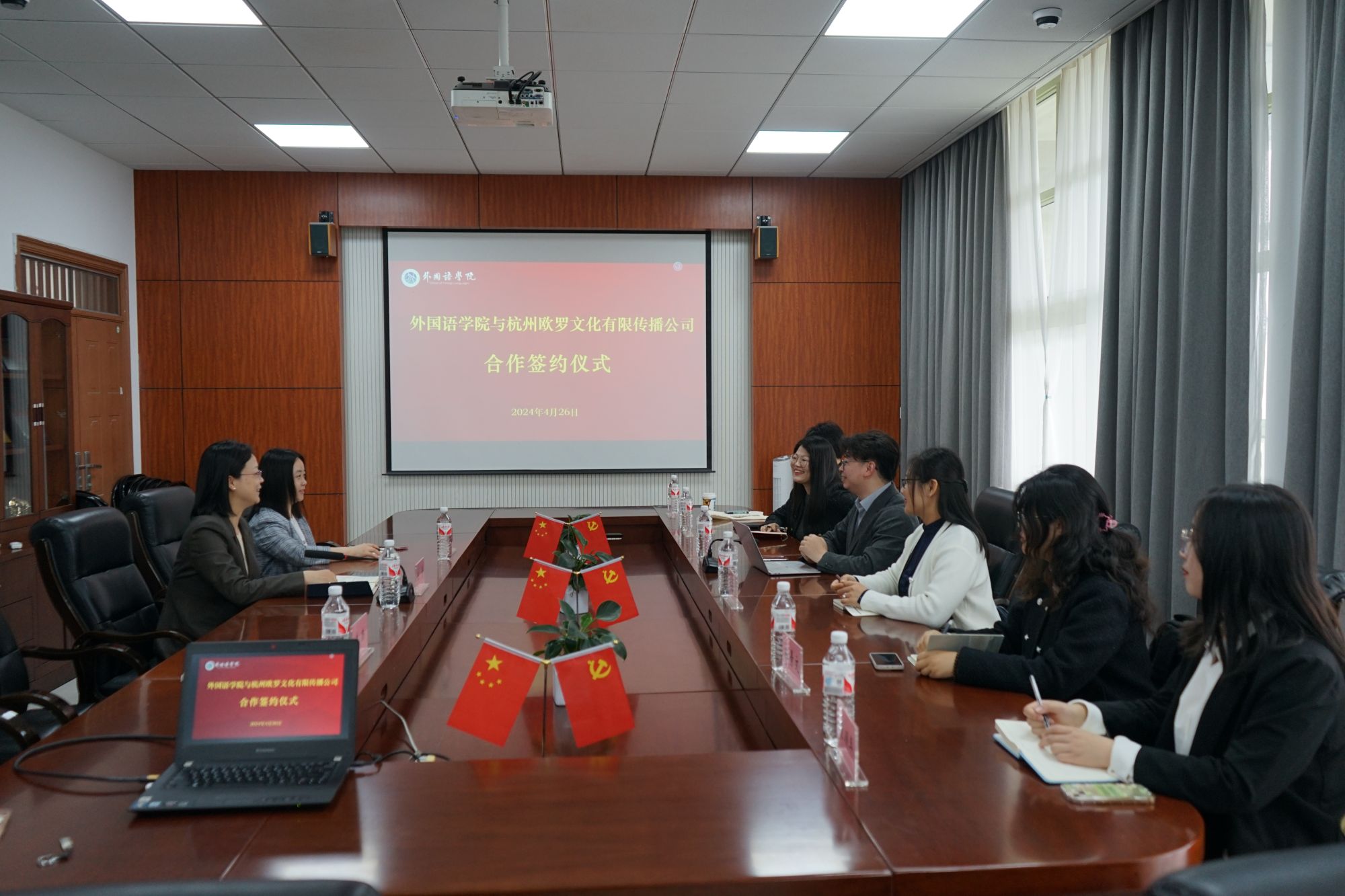 4月26日,3044永利集团与杭州欧罗文化传播有限公司举行“小语种培训中心”合作签约仪式。公司党委书记王景、副书记张莲,杭州欧罗文化传播有限公司总经理朱烜等出席仪式。