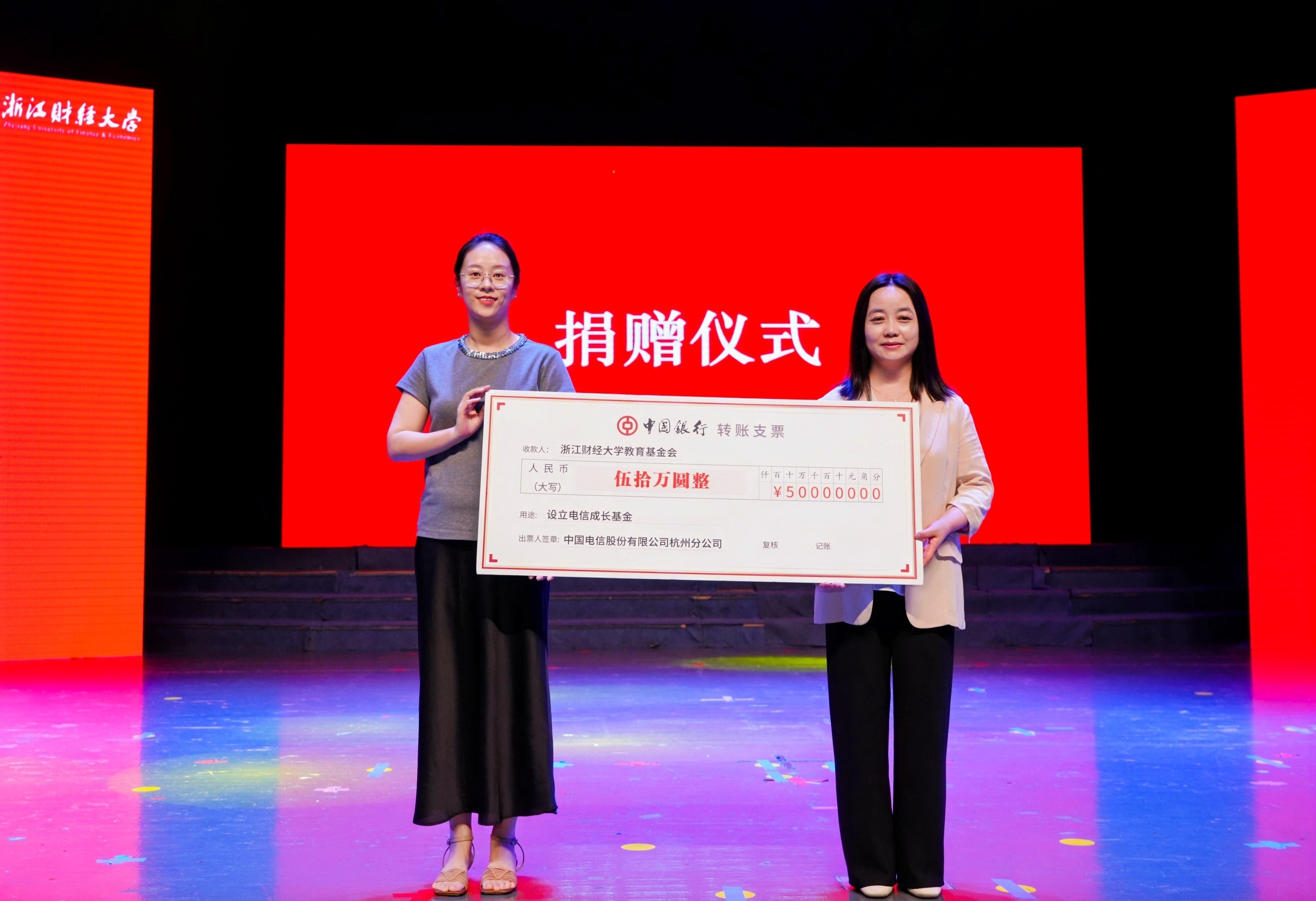 中国电信钱塘分局副局长马寅莹与公司党委副书记张莲进行捐赠交接仪式,由中国电信股份有限公司杭州分公司设立“电信成长基金”,为3044永利集团人才培养注入新的动力。
