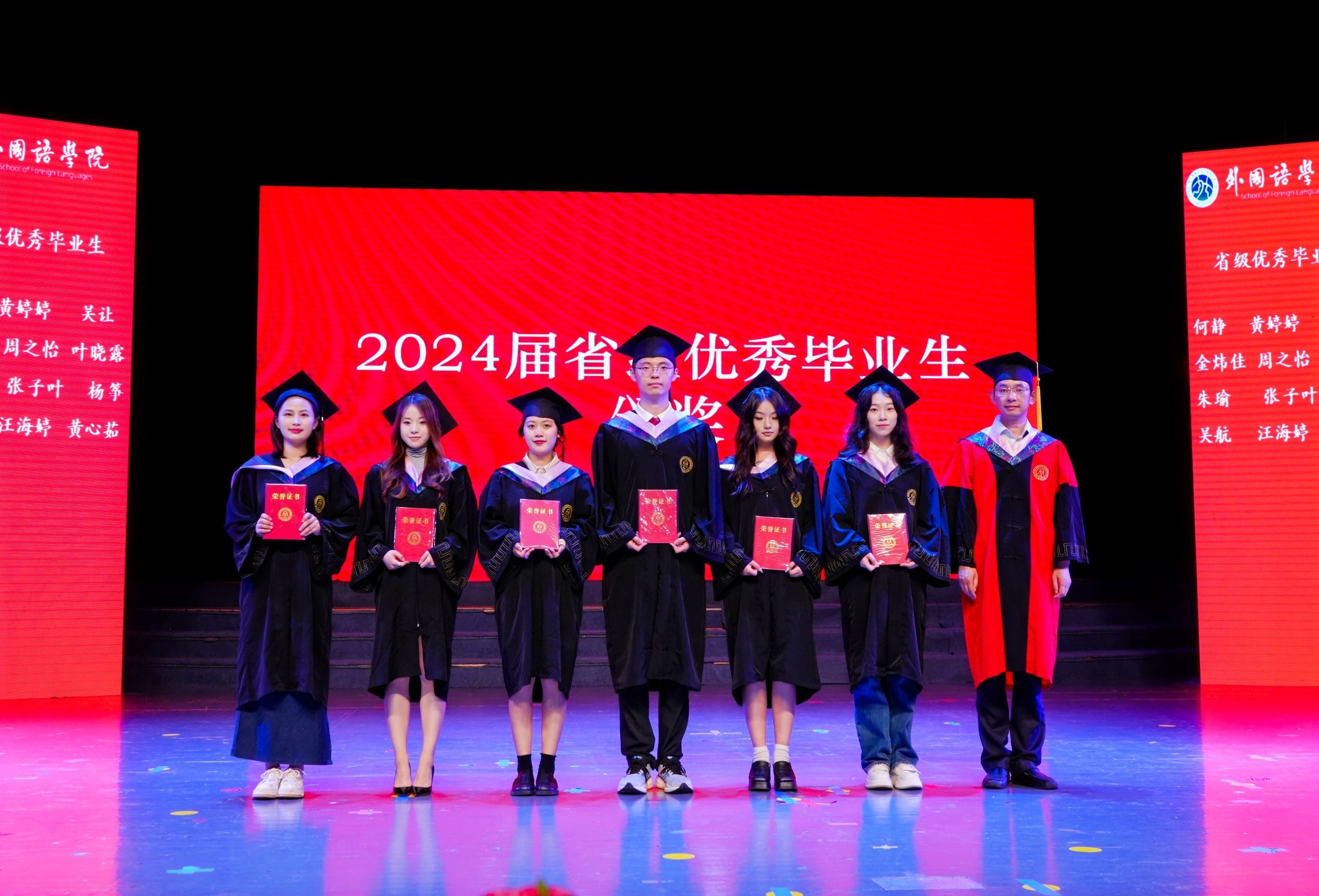 在师友、家人的见证下,在热烈的掌声中,英语、日语、商务英语专业本科生及研究生们依次上台,拔穗正冠,与师长合影留念。