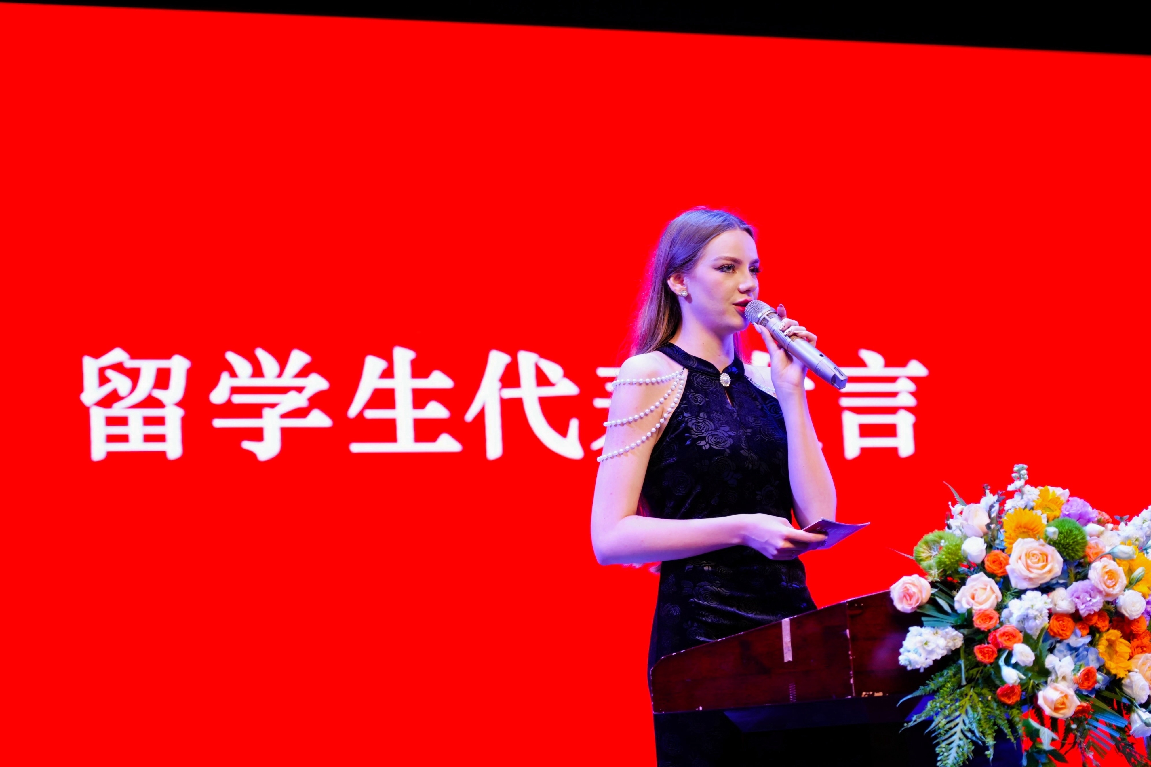 教师代表杨晨音表达对毕业生的殷切期望和美好祝愿。“只要人和人在交流,文化和文化在交融,我们外语就会被需要。”从青涩到成熟,老师见证了大家的成长蜕变。即将离开校园,满是欣慰和不舍,祝福大家鹏程万里。