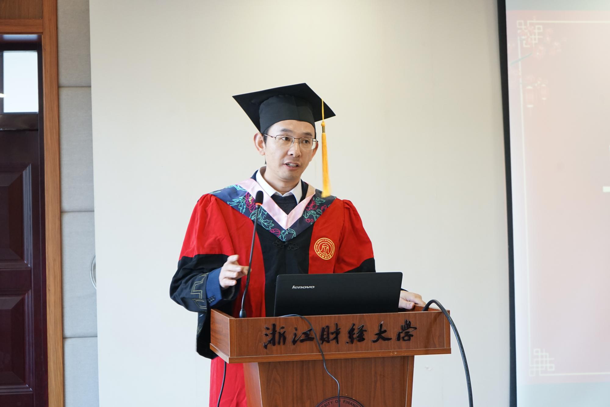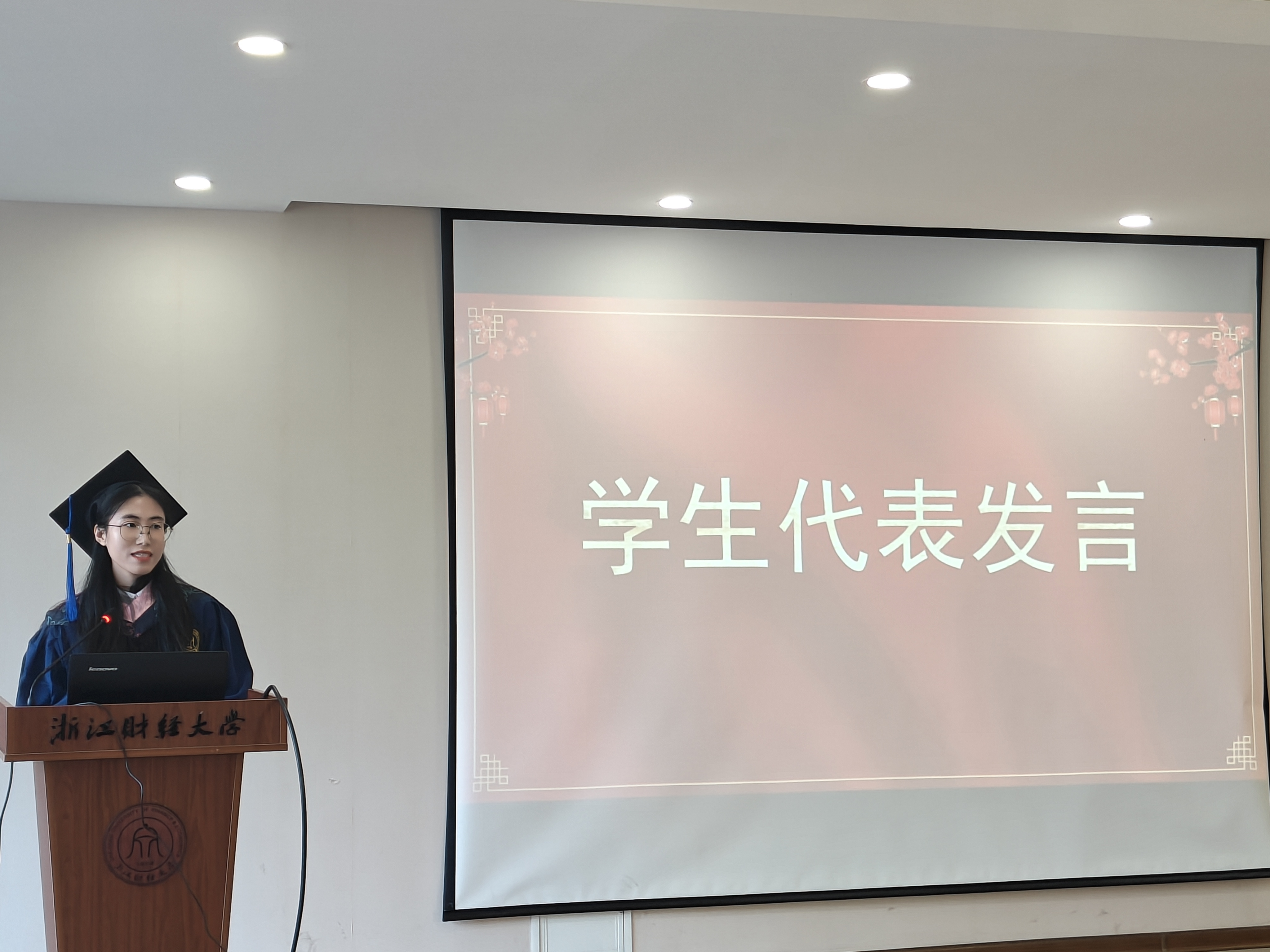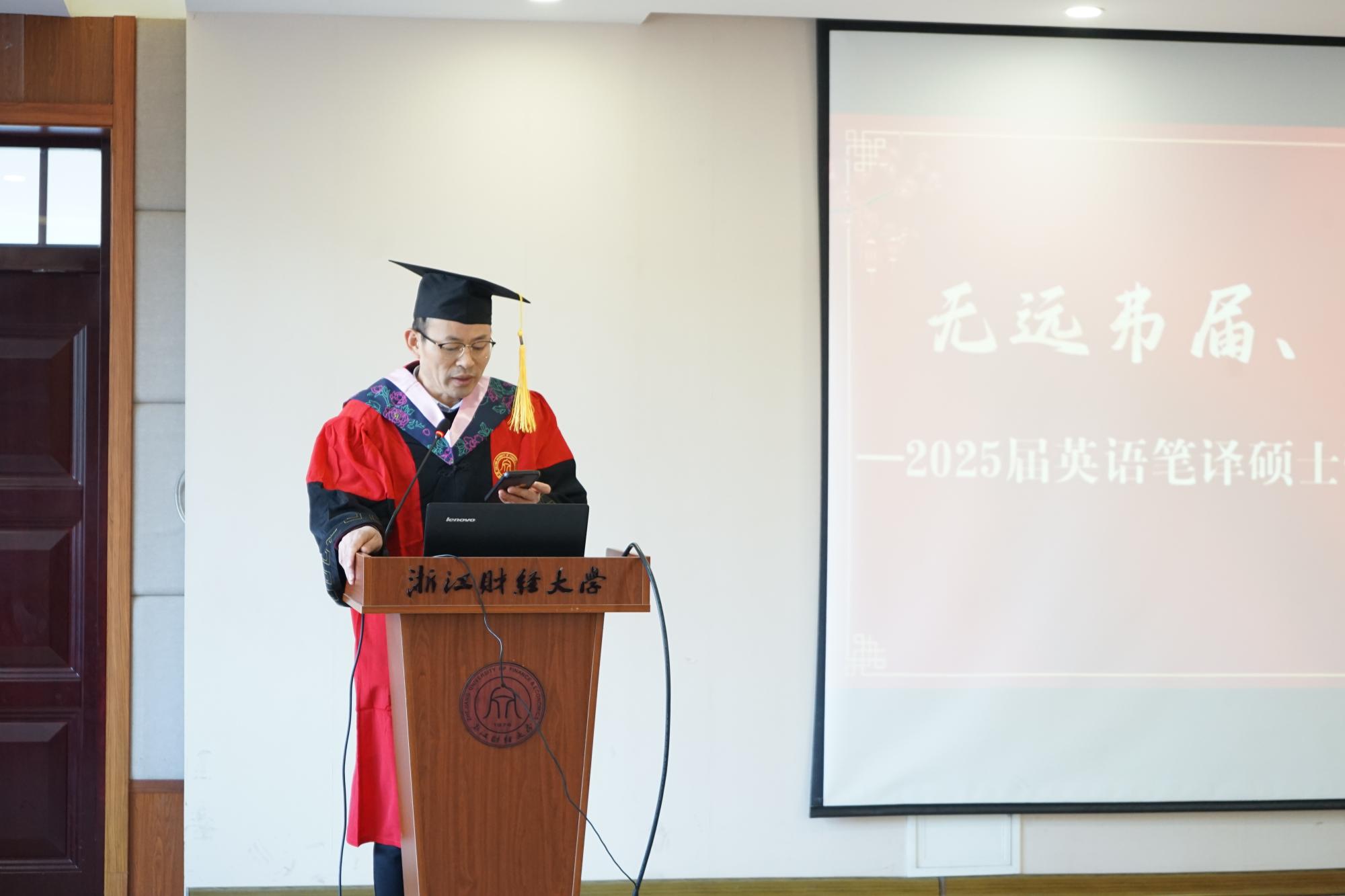 导师代表熊建国老师满怀深情地发言,回顾了毕业生们在校期间的成长瞬间——从课堂上的专注学习到翻译实践中的不懈努力,字里行间洋溢着欣慰与不舍。他嘱托毕业生珍惜时光,秉持初心,在面对未知和挑战时保持韧性与坚毅,用知识点亮未来,用勇气和智慧书写属于自己的精彩人生。他期待同学们以专业知识为世界勾勒一个真实、立体、全面的中国形象,肩负起国际传播和文化交流的重任,成为塑造中国形象的中坚力量。他坚信,公司的教育与实践必将成为毕业生们未来发展的坚实基石。