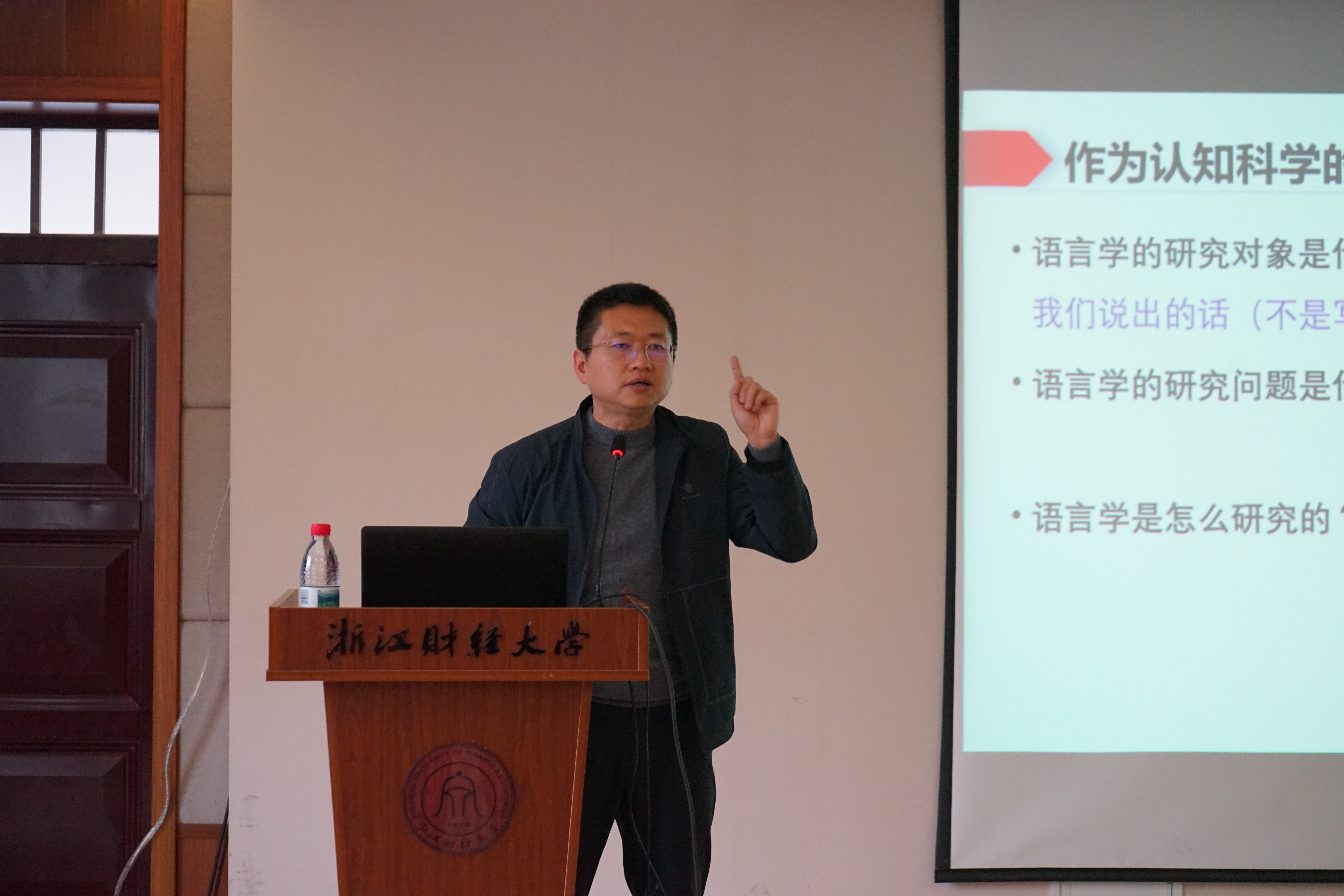 庞教授首先以“语言学是什么”和“语言学都在做什么”发问,引出语言学研究的对象、问题和方法。他指出,语言学研究的主要对象是我们说出来的自然的话语。语言学研究的主要问题是我们何以可能说话,回答这个问题的关键就是假设人脑中有能够让我们如此说话的语言知识,其中就包括语音、句法、语义和语用等等知识。