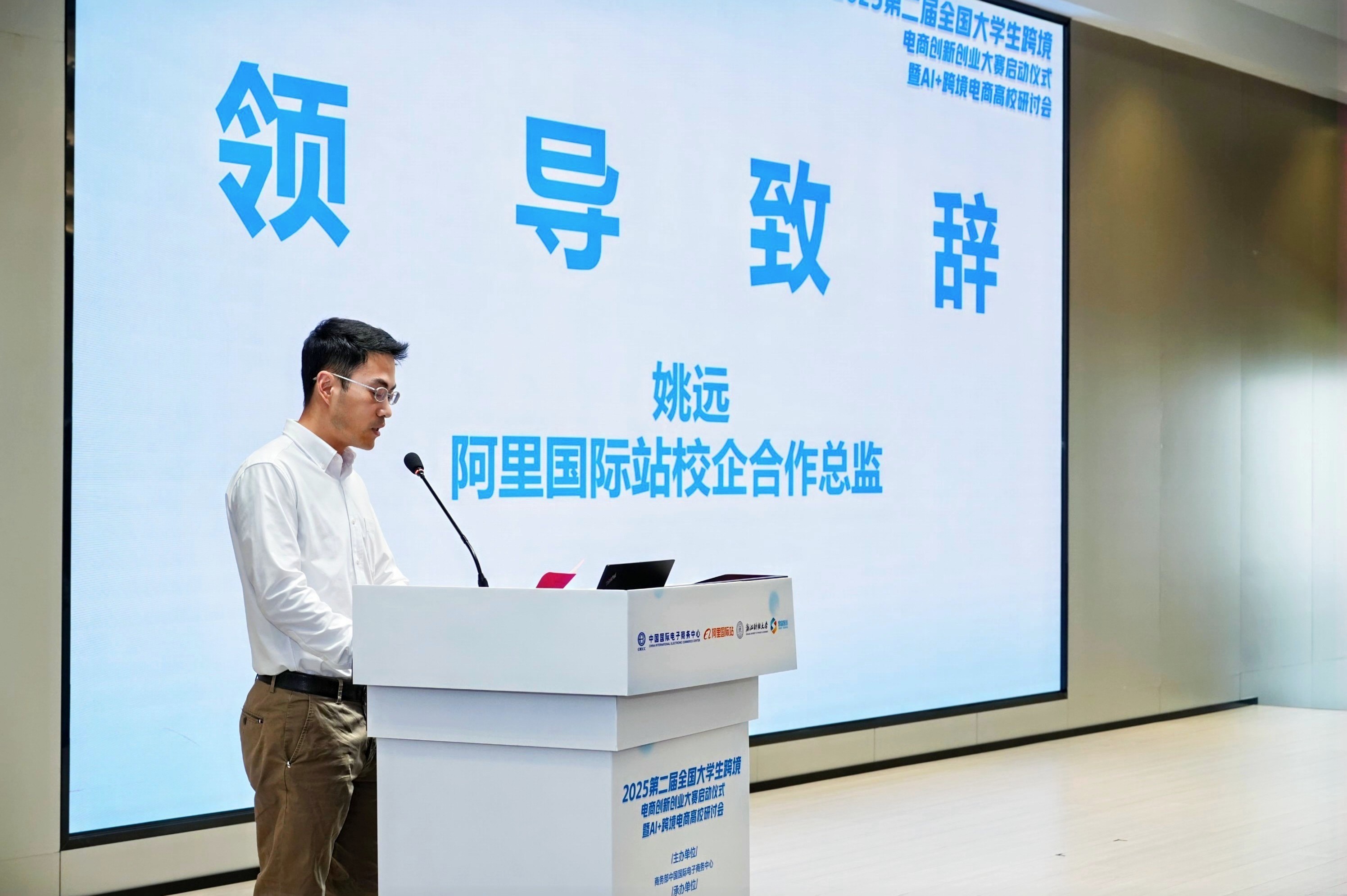 姚远代表阿里国际站向大赛的顺利开幕表示热烈祝贺,并介绍了本届大赛的创新和升级之处。他鼓励老员工要善于利用前沿技术解决跨境电商产业链痛点,期待青年创业者以创新方案突破行业边界,让更多跨境电商企业获得创新动能,让高校的智慧转化为产业升级的源动力。
