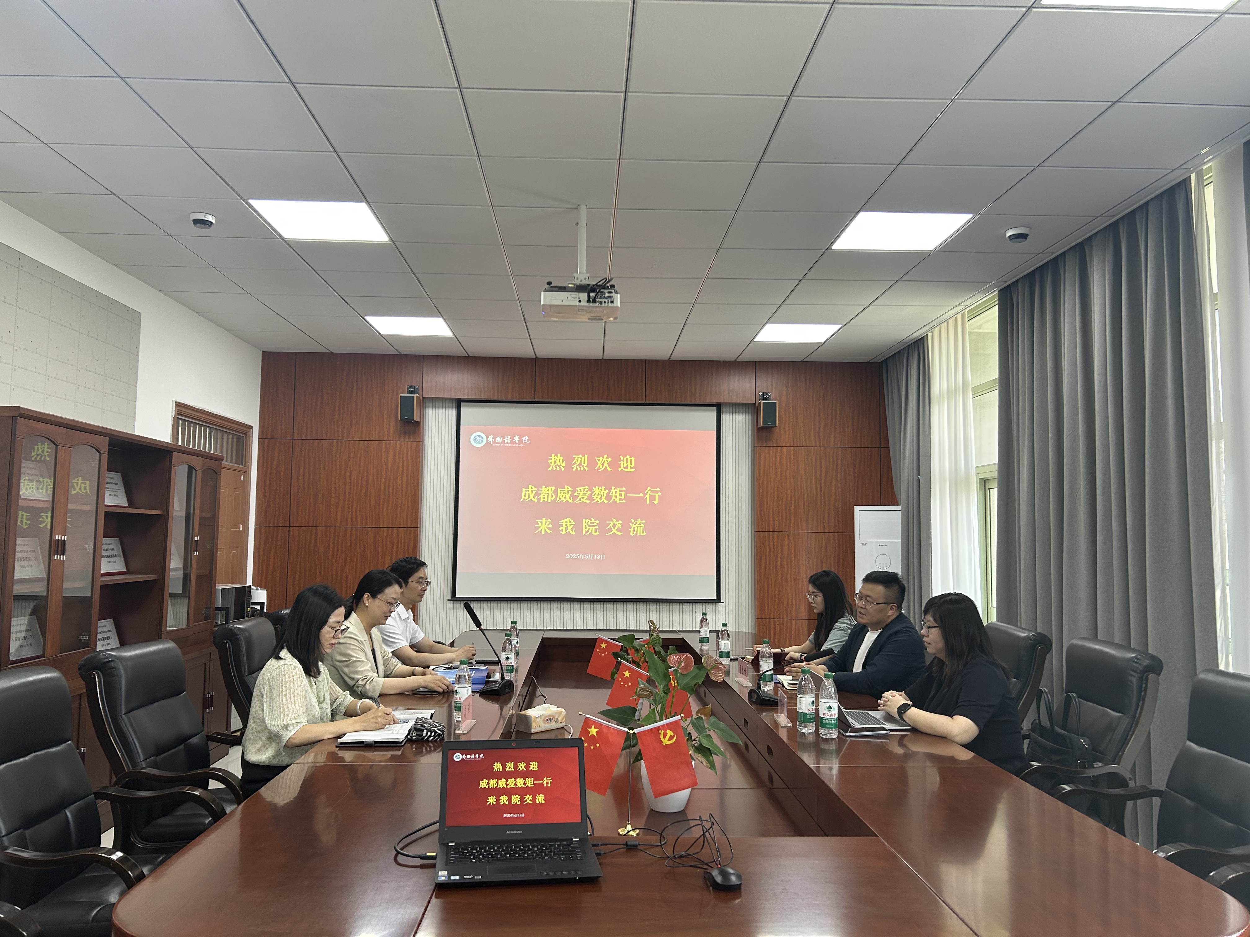 为推进虚拟仿真实验室建设,探索人工智能与外语公司产品深度融合的新路径,5月13日,成都威爱数矩公司华东区运营总监曹昌峰、校企合作导师曹清清及华东市场总监贺洁玉一行到访公司,与公司党委书记王景、副经理熊建国、实验员高燕就合作事宜展开深入交流。