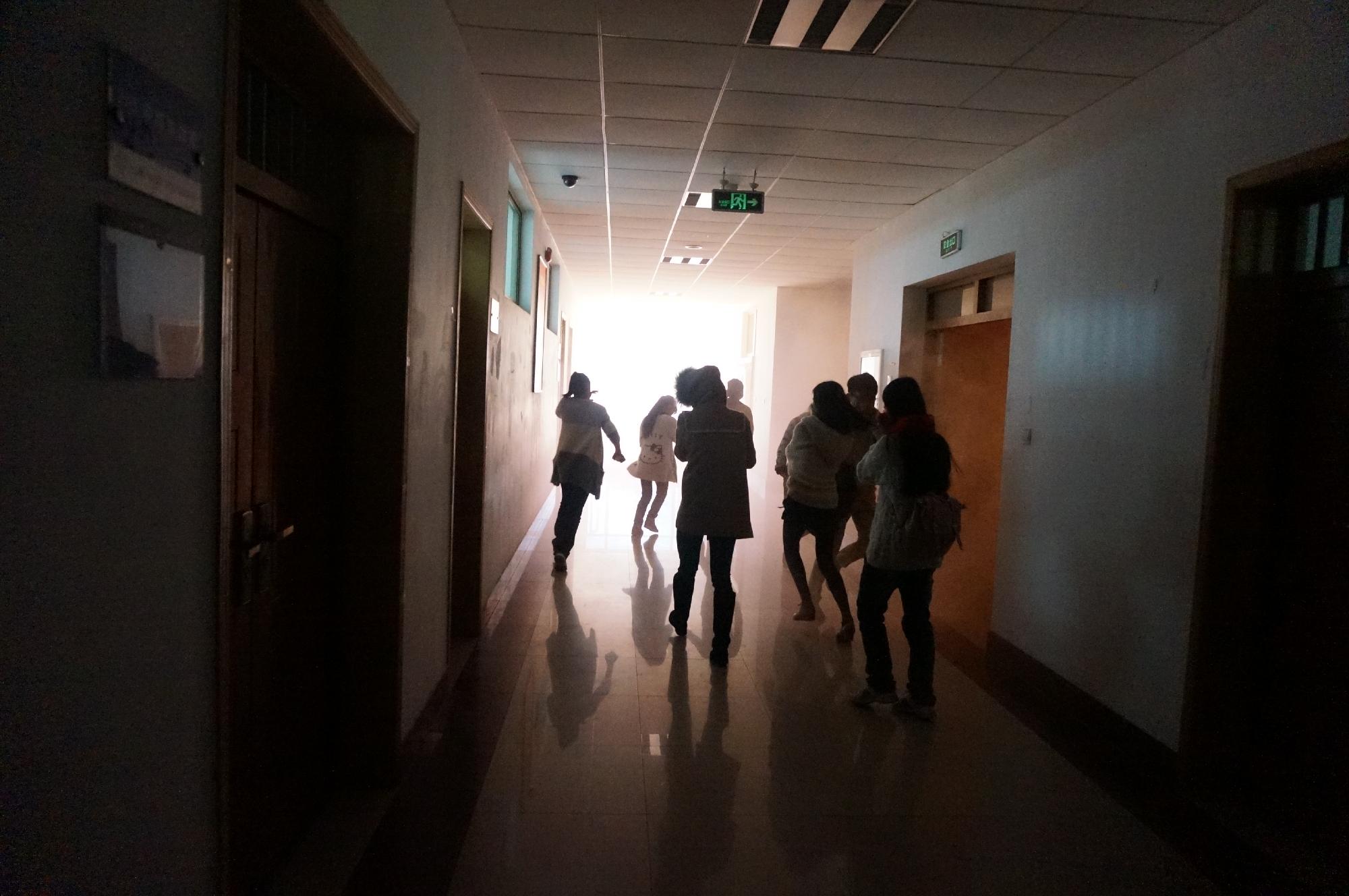 13时许,消防应急疏散演练正式开始。外语公司楼二楼某教室起“火”,浓烟滚滚,“火势”向上蔓延。即刻,火情报警笛音鸣响。伴随着阵阵“烟雾”,同学们根据所掌握的火灾逃生自救知识,用湿毛巾掩口鼻、降低重心、俯身在浓浓烟雾中沿楼道出口指示灯方向迅速而有序的撤离危险区域,没有人在撤离中使用电梯。公司消防应急小组随后对整个公司楼进行了疏散监控和人员清点,10分钟后疏散演练结束。