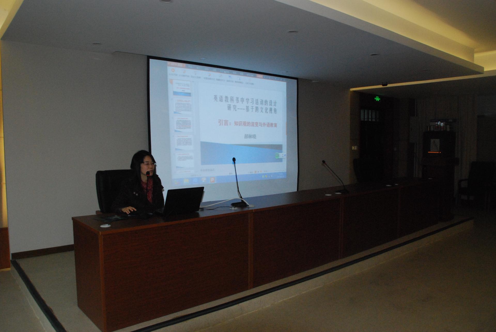 郝林晓博士从知识观的流变与外语教育着手,向与会教师介绍了现代课程知识观的概念,进而分析课程知识本质研究的走向。她指出课程知识的本质呈现出由绝对走向相对,由抽象走向境域,由先天给定走向流动意义。这一变化表明,课程知识绝无永恒的、超时空的、确定的本质。之后,她结合自身博士论文的选题和撰写过程,分享了其博士论文的研究思路与框架、研究内容及研究启示。她指出,英语教科书跨文化交际主题学习活动可以促使英语教学过程中学习者语言本体知识、语言技能和跨文化交际能力的培养同步展开,这是英语教科书跨文化交际主题学习活动的主要价值与功能所在。