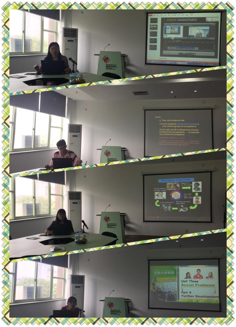 近期,公司《大学英语》课程与浙江工商大学联合申报浙江省精品在线开放课程,该课程转变教学理念,对教学内容信息进行再创造并通过微课形式重新呈现,在教学知识点的分解、重构、教学时间空间的压缩、精炼,以及幕后设计、制作过程等各个环节都对教师提出了新的挑战。四位参与在线课程制作的老师,分别从“单元主题导入”(蔡小燕)、“核心课文结构分析”(邱瑜毅)、“语言知识化解”(崔爽畅)、“语言能力拓展”(王军华)等方面进行了经验分享。他们思路独特,各展其才,既具体演示了微课制作的技巧,又呈现了汇集智慧和心血的精彩成品,并从技术与艺术、理论与实践角度与老师们一起展开了热烈探讨。