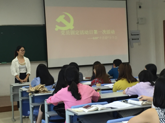 成斯施同学则作为新闻宣传部境外记者注册媒体组成员参与到G20中去。她生动形象地向我们介绍了G20会议内部的保密教育等一系列培训,每天深夜结束工作回来都处于疲惫状态的她第二天醒来又是精神百倍,这样的一次工作经历成为了她“生命这条笔直长线中的一颗闪亮而耀眼的星星”。第一次“党员固定活动日”在三位党员同志的生动讲演和同学们热烈的互动中结束。