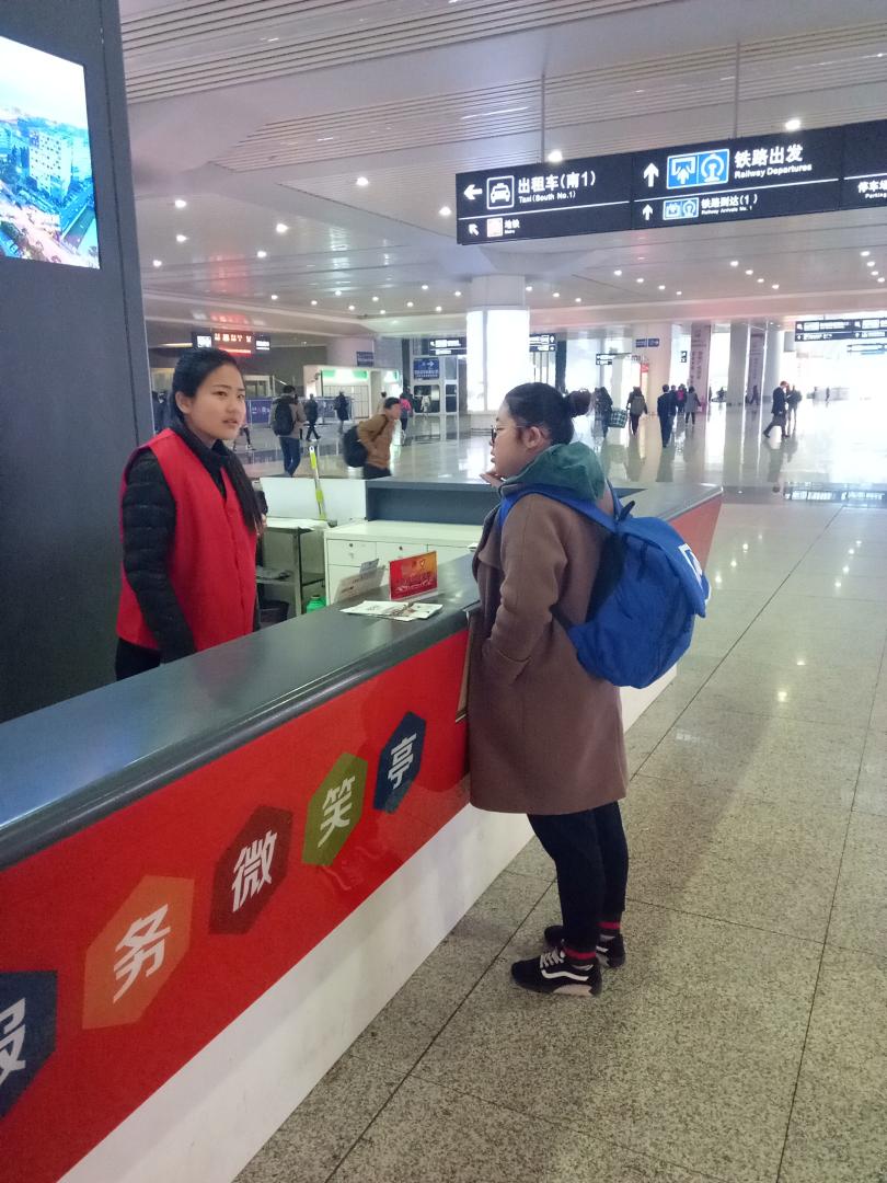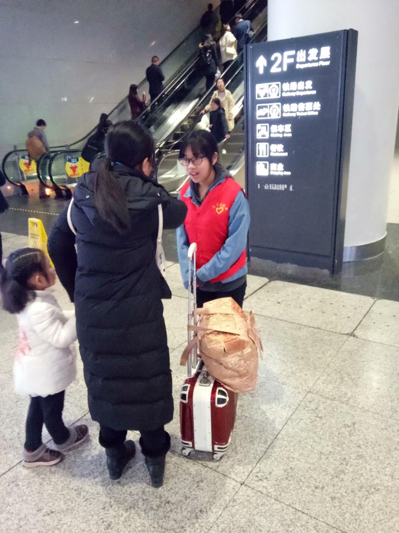 志愿者们的大本营就在杭州东站的爱心亭,工作人员对大家进行了详细的业务培训,并亲自带着大家熟悉东站功能分布。志愿者们边仔细聆听,边将重要事项一一记下。志愿者们分为两个小组,一个小组在爱心亭为旅客提供引导、答疑服务,另一组在各电梯出入口帮助旅客出入站。杭州东站客流量巨大,功能分布复杂 ,又恰巧是双休日,来往的旅客川流不息,需要帮助的旅客也络绎不绝。小伙伴们几乎没有闲下来的时间,她们不仅要耐心地一遍遍为旅客指路、解答问题,又要帮助老人、妇女提携行李。上午,一个老奶奶由于迷失方向找到了爱心岗亭的志愿者们,小伙伴们热情地解答了老奶奶的问题,而且又帮老奶奶提携行李,把她送到了目的地。老奶奶一句真诚的感谢,一个热忱的笑脸,让小伙伴们的疲劳一扫耳光,这就是人与人之间互相关爱、互相感恩的温暖,也是雷锋精神的现实体现吧。