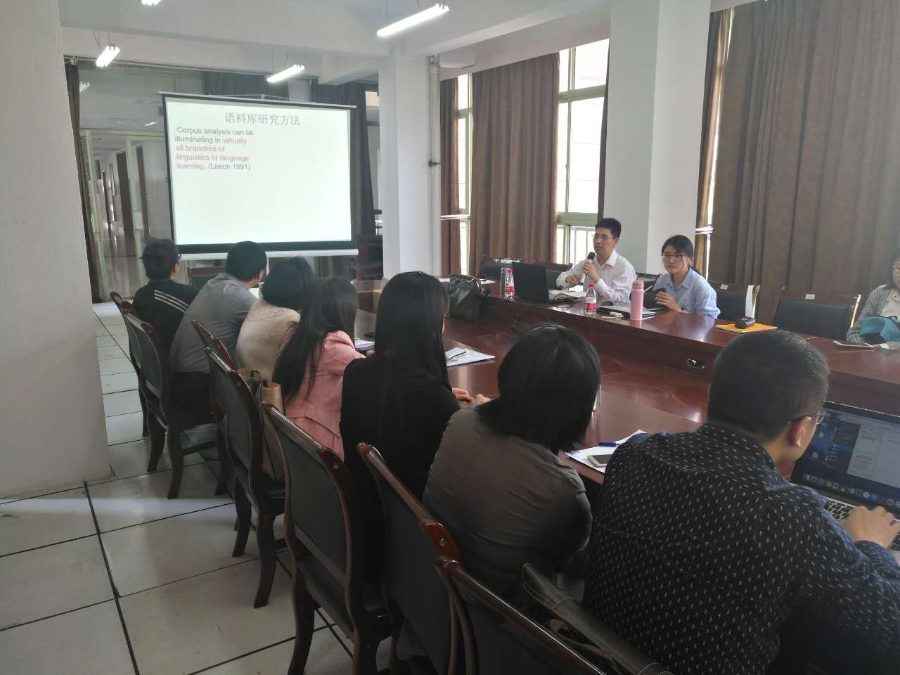 邵斌教授首先从什么是语料库,为什么要使用语料库,深入浅出地介绍语料库的基本知识。紧接着,他介绍了一些常用语料库,并从“语言学科研选题怎么来”这一话题切入,以罗素散文中的一个段落为例,分析了语料库在英语形态、语义、短语、句法、语篇等方面的科研价值,并指出了语料库语言学研究发展的两个趋势,即跨学科研究与语料库数据的可视化。郑李卉博士围绕语料库文本的收集、清理、标注、分析四个步骤,为在座师生细致地介绍了语料库软件的操作方法,并以学习者语料库为个案,详细解读学习者语料库在教学和科研中的使用。