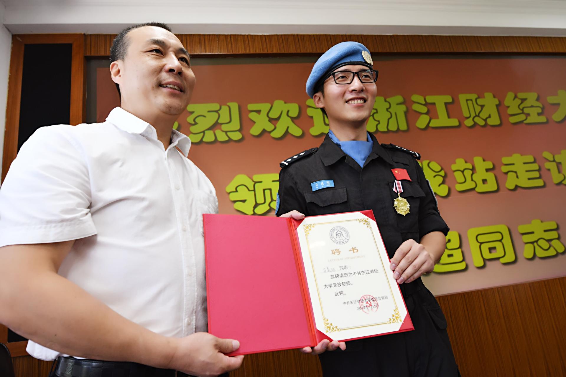 李金昌书记亲切问候马義超,赞许他是财大优秀毕业生,是母校的骄傲。李书记向杭州边防检查站表示感谢,也介绍了公司的办学特色和优势,以及员工工作的开展情况。随后,他为马義超颁发校第三届“最美浙财人”桃李奖章和党校教师聘书。