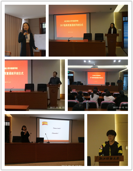 10月12日下午,公司首期(2017级)英西复语班在8108会议室开班。教务处林亚芳副处长,黎昌抱经理、曹道根副经理,西班牙语专业教师姬宇鹏、陈婉玉,团委书记胡恺,以及2017级英西复语班全体同学参加开班仪式。仪式由曹道根副经理主持。