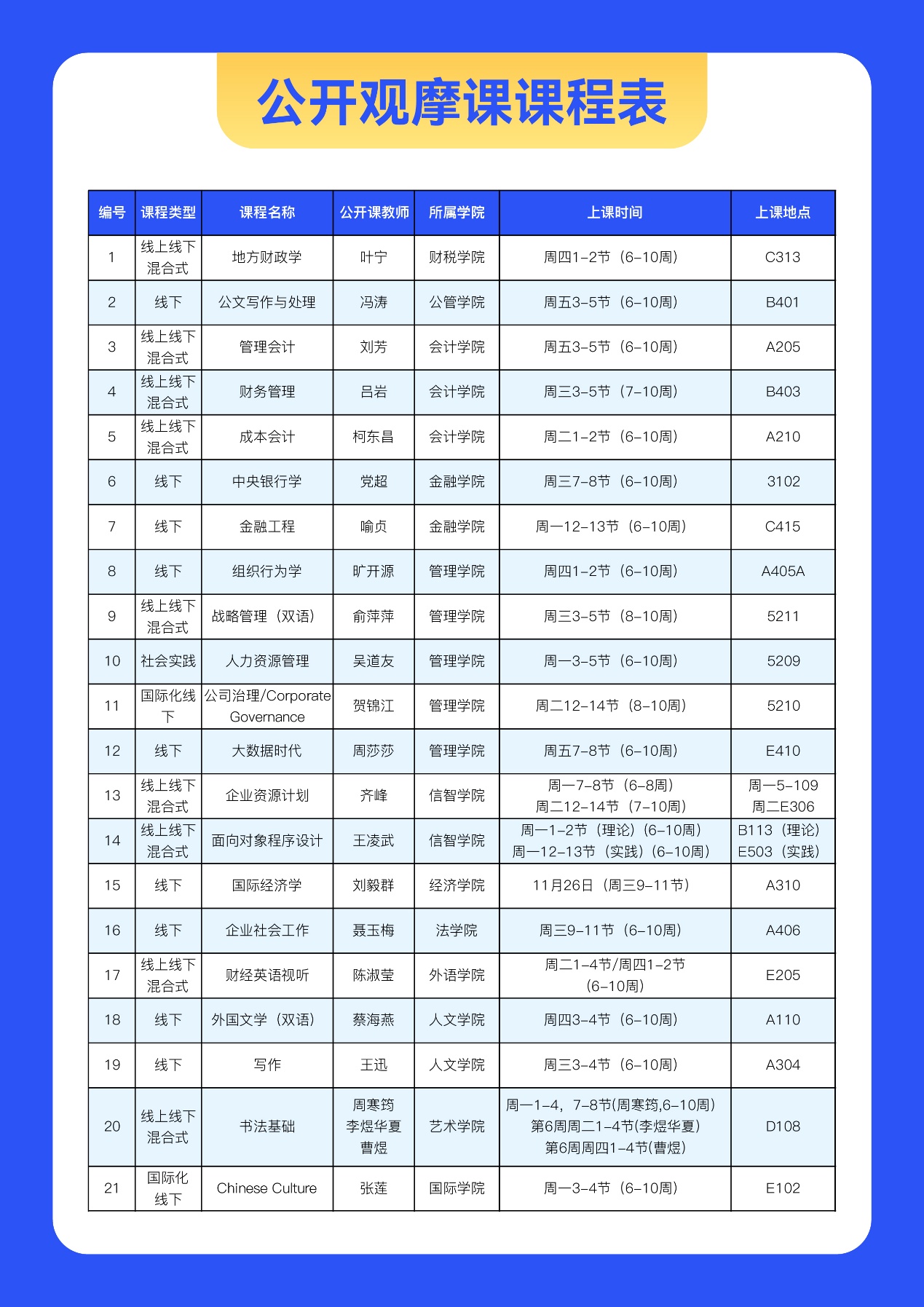 一、观摩时间:主要集中在教学周第6—10周(10月27日-11月28日),各门课程具体开放观摩时间、地点如下表。