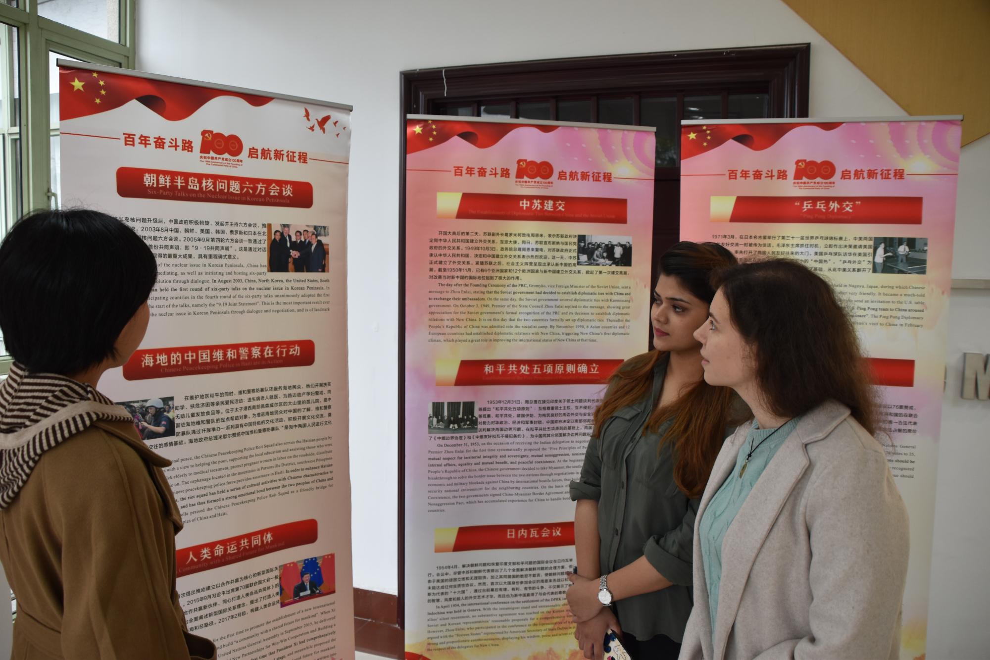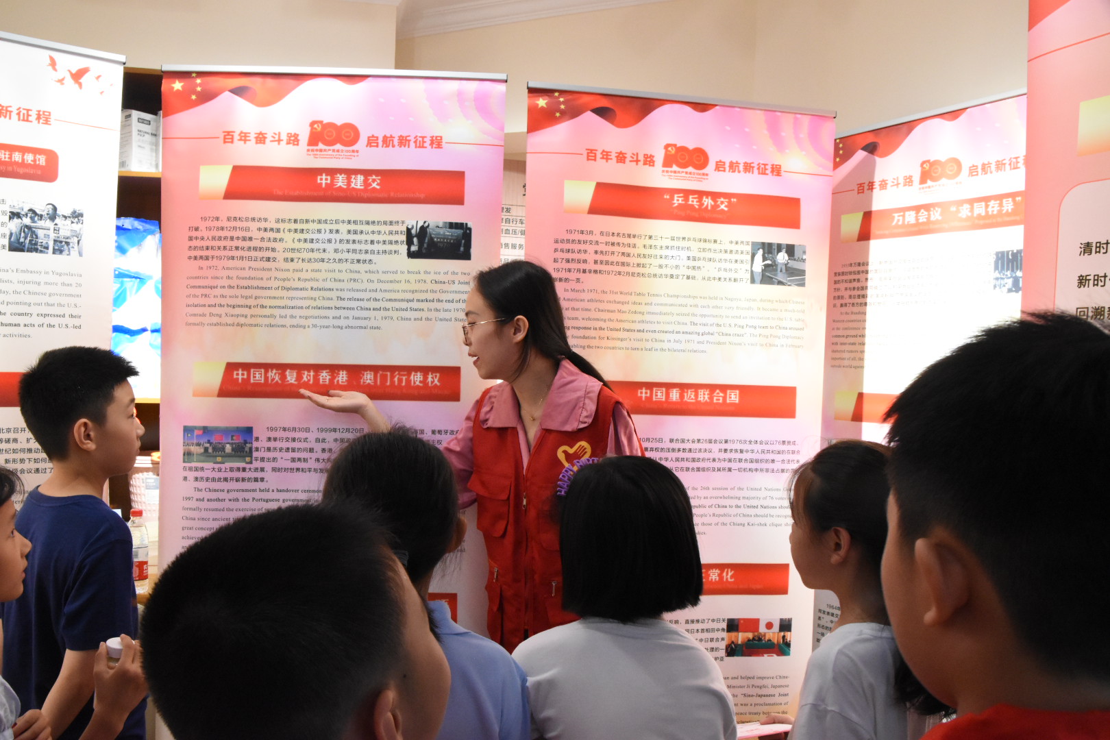 在讲解中,志愿者们以新中国外交史的重大历史成就为主线,介绍了“中国恢复对香港、澳门行使权”“首次中国-东盟首脑非正式会晤”“首届中国国际进口博览会”“习近平外交思想指导地位的确立”等几大主题内容,将专业知识与百年党史结合,寓教于乐地呈现出来。