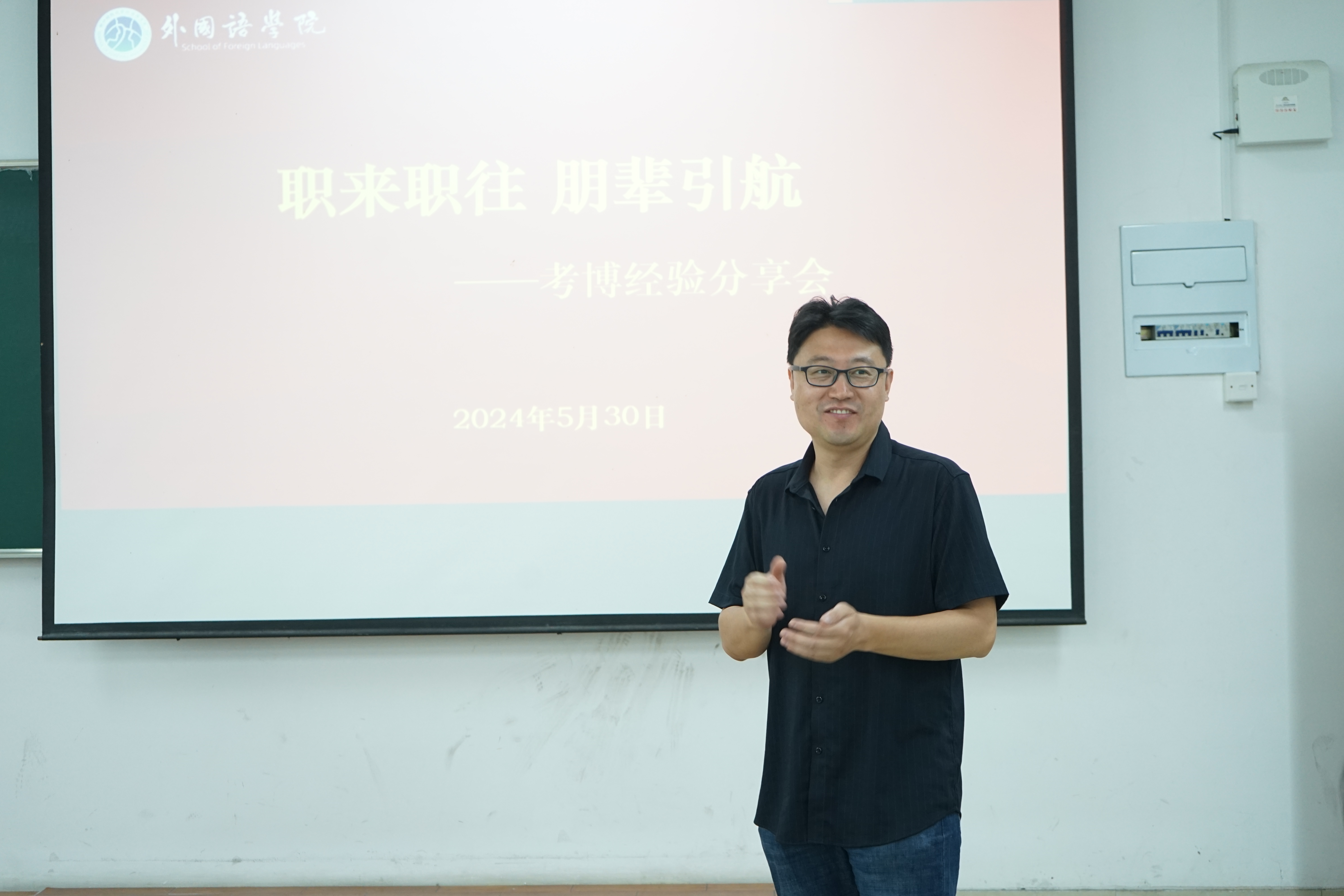 邵平宇同学成功考取了西南交通大学译介学方向的博士研究生。他主要从前期科研成果的积累与后期申博过程中如何联系导师这两个方面分享了自己的经验。邵平宇同学强调前期学术积累很重要,鼓励大家多投稿,多参与硕博研究生博士论坛,结识更多优秀同学、拓宽学术视野。