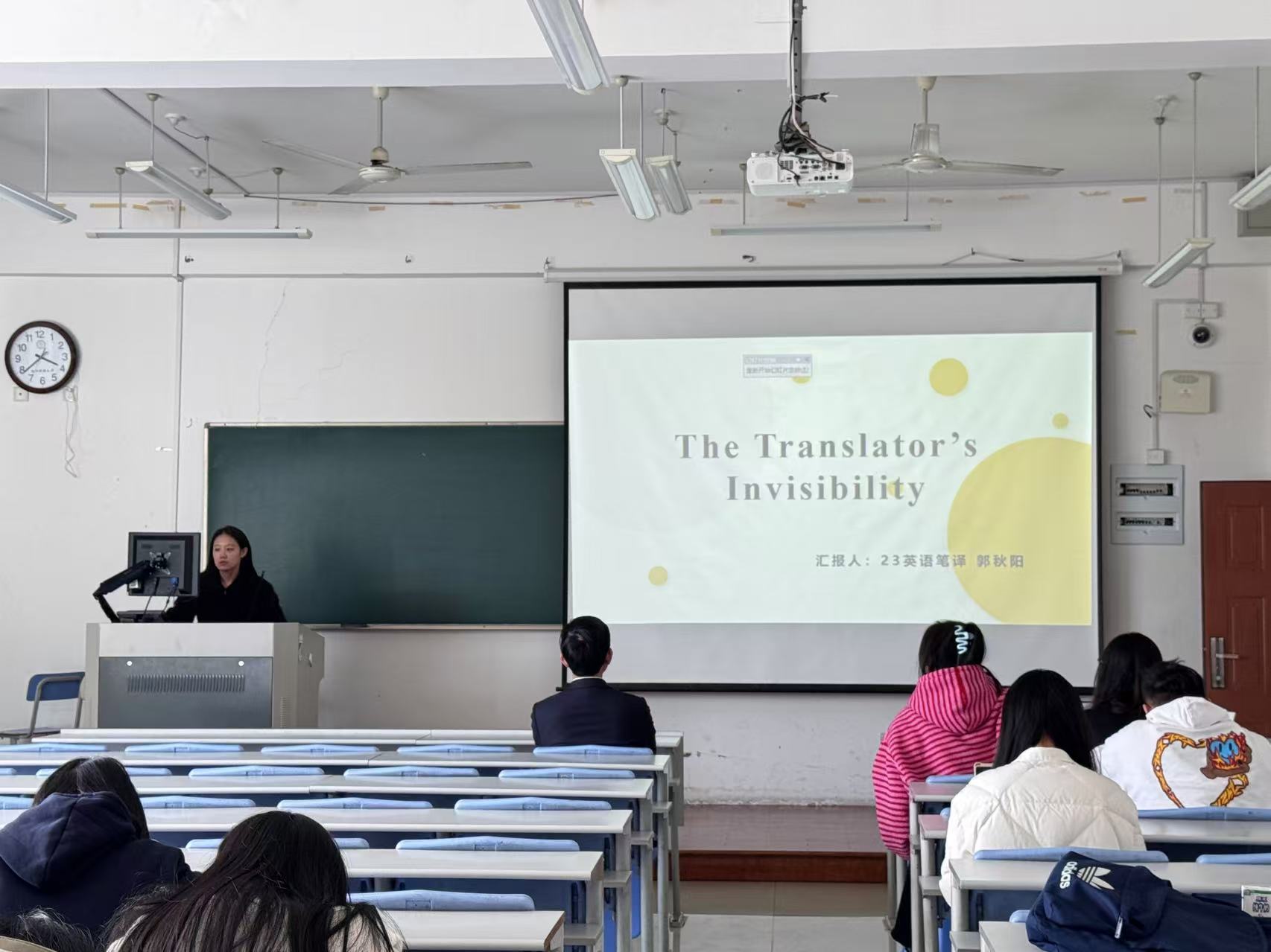 2024年11月28日,郭秋阳作了主题为“The Translator’s Invisibility”的读书报告,熊建国老师进行点评交流。该读书报告会以“译者的不可见性”为主题,详细介绍了译者不可见性的具体含义,归化异化的内涵以及在具体翻译中的运用。在交流讨论环节中,熊建国老师针对该读书报告进行了专业点评,并提出了修改意见以望参考。最终读书报告在老师及同学们的热烈讨论中圆满结束。