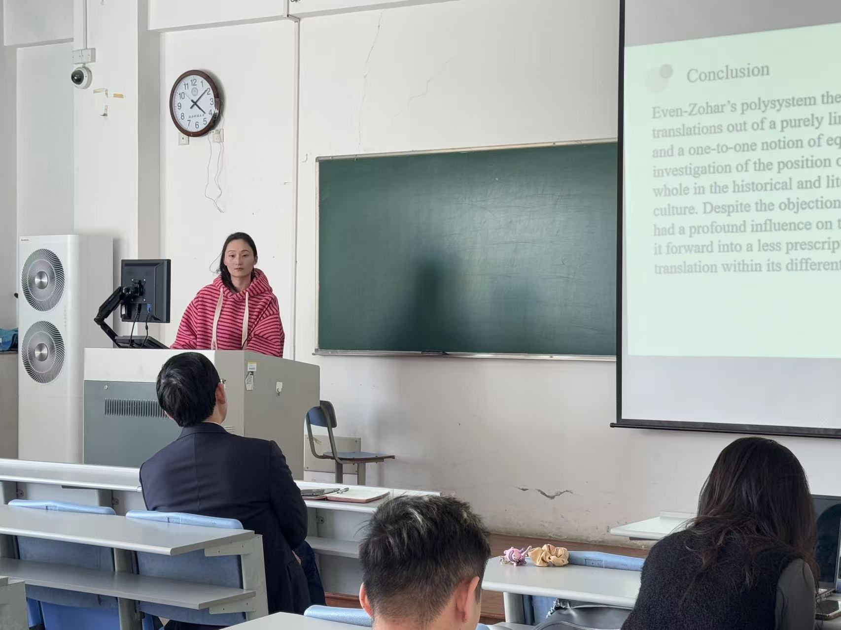 2024年11月28日,张露露作了主题为“Polysystem Theory”的读书报告,熊建国老师进行点评交流。该读书报告会以“多元系统理论”为主题,详细介绍了埃文·佐哈尔在20世纪70年代所提出的多元系统理论。在交流讨论环节中,熊建国老师针对该读书报告进行了专业点评,并提出了修改意见以望参考。最终读书报告在老师及同学们的热烈讨论中圆满结束。