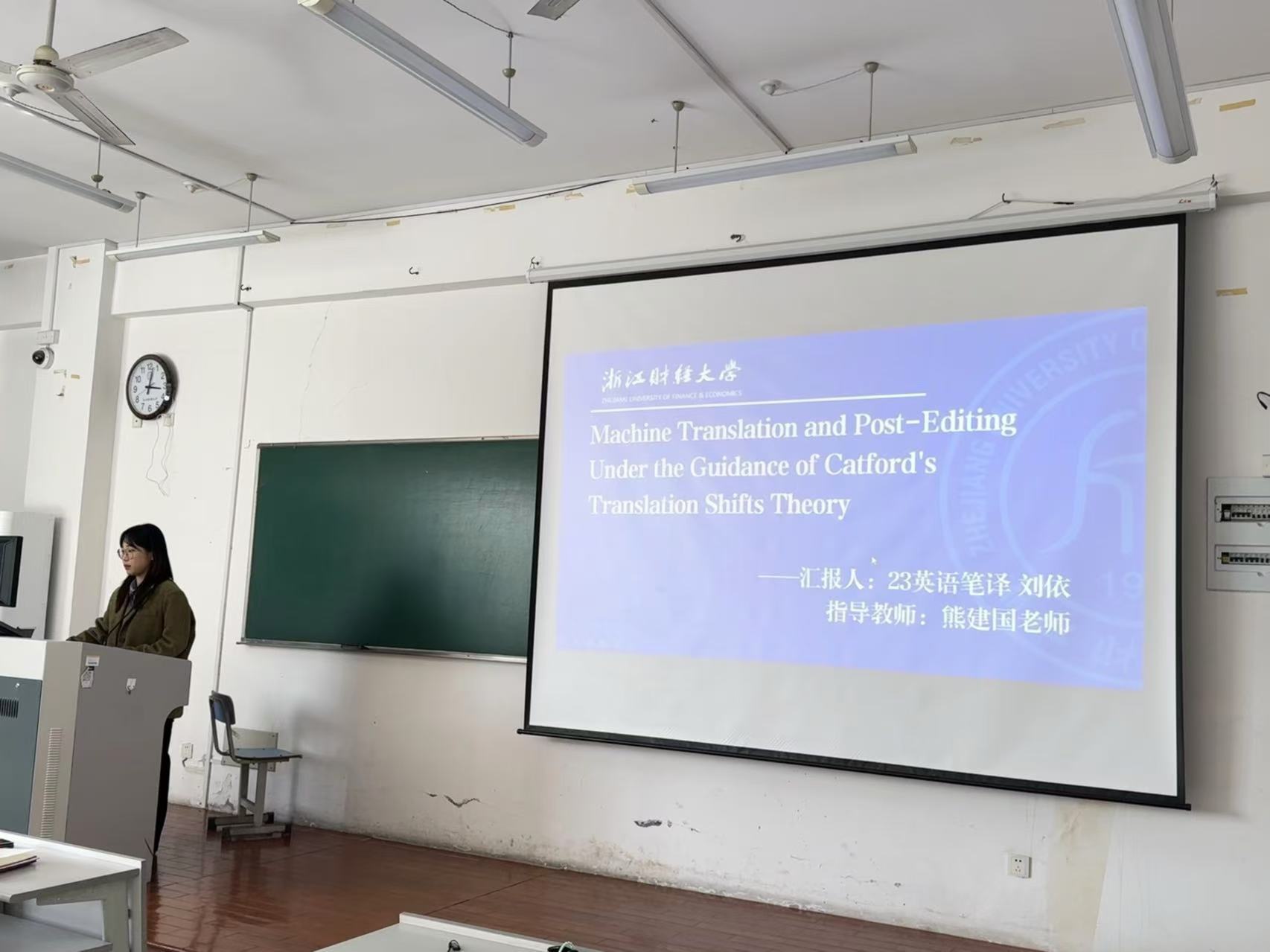 2024年11月28日,刘依作了主题为“Machine Translation and Post-Editing Under the Guidance of Catford's Translation Shifts Theory”的读书报告,熊建国老师进行点评交流。该读书报告会以“卡特福德翻译转换理论指导下的机器翻译和译后编辑”为主题,详细介绍了卡特福德翻译转换的几种类型以及机器翻译的现状,并在该理论的指导下通过案例分析对机器翻译的译文进行有针对性的译后编辑。在交流讨论环节中,熊建国老师分别针对该读书报告进行了专业点评,并提出了修改意见以望参考。最终读书报告在老师及同学们的热烈讨论中圆满结束。