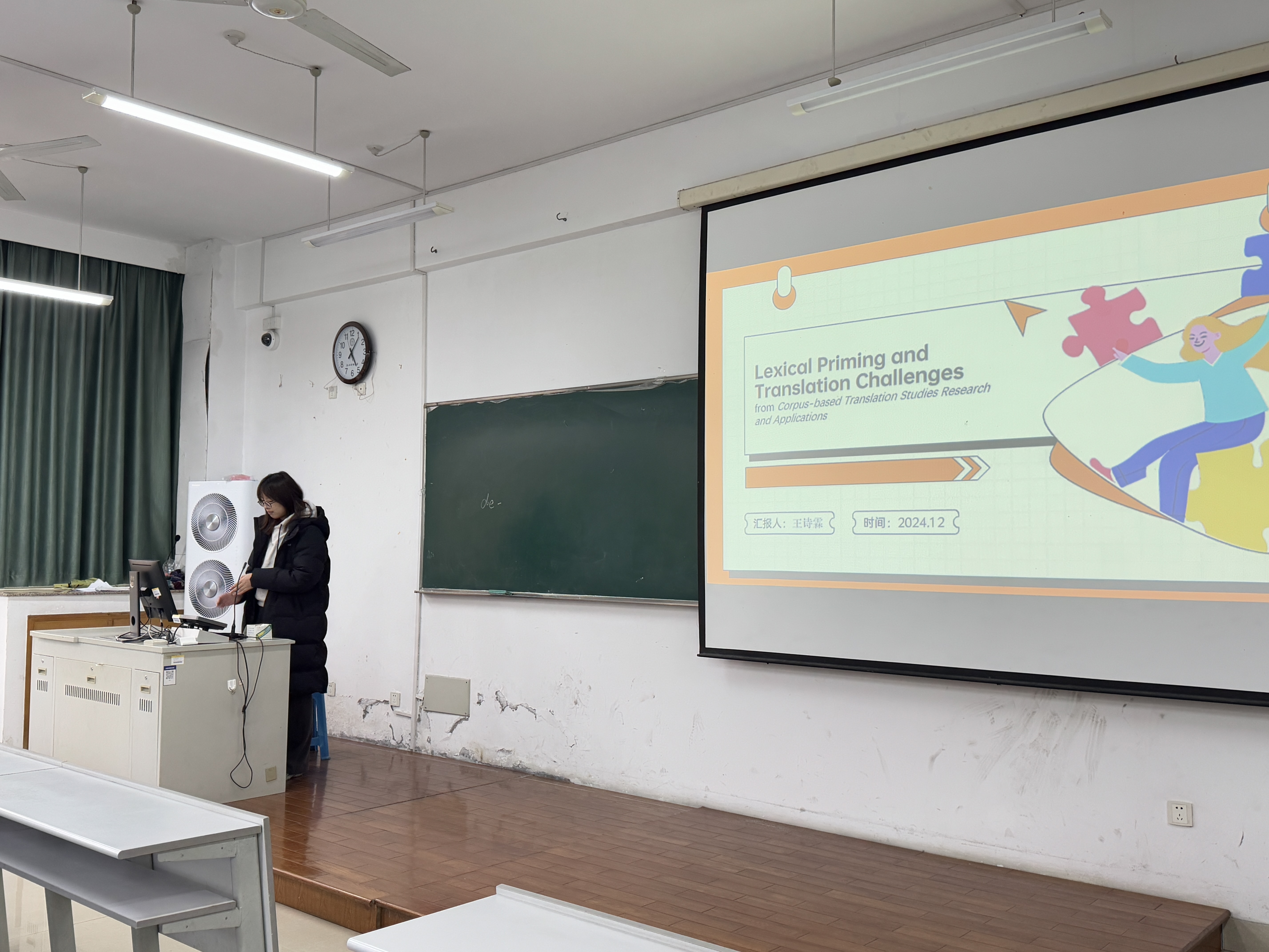2024年12月5日,王诗霖作了主题为“Lexical Priming and Translation Challenges”的读书报告,徐莎莎老师和刘金路老师进行点评交流。该读书报告会以“词汇触发理论及其翻译挑战”为主题,详细介绍了词汇触发理论主要揭示英语词汇的搭配关系、语义关联及语类特征等常见语言使用模式中的互动行为。在交流讨论环节中,徐莎莎老师和刘金路老师分别针对该读书报告进行了专业点评,并提出了修改意见以望参考。最终读书报告在老师及同学们的热烈讨论中圆满结束。