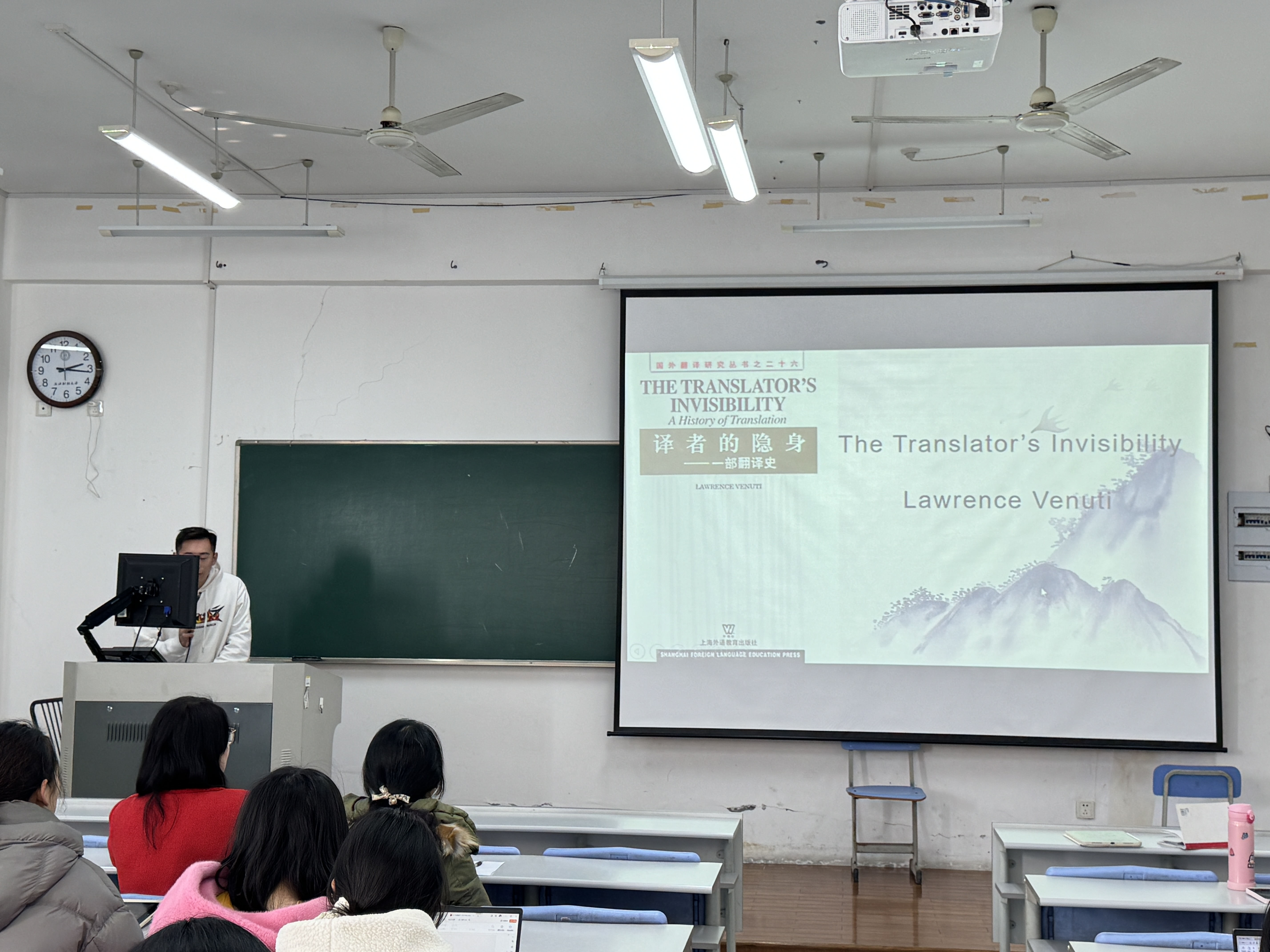 2024年12月24日,朱科烜作了主题为“The invisibility of translators”的读书报告,缪佳老师和郝林晓老师进行点评交流。该读书报告会以“译者的隐身”为主题,详细介绍了译者的隐身、归化和异化在黑神话悟空中的体现。在交流讨论环节中,缪佳老师和郝林晓老师分别针对该读书报告进行了专业点评,并提出了修改意见以望参考。最终读书报告在老师及同学们的热烈讨论中圆满结束。