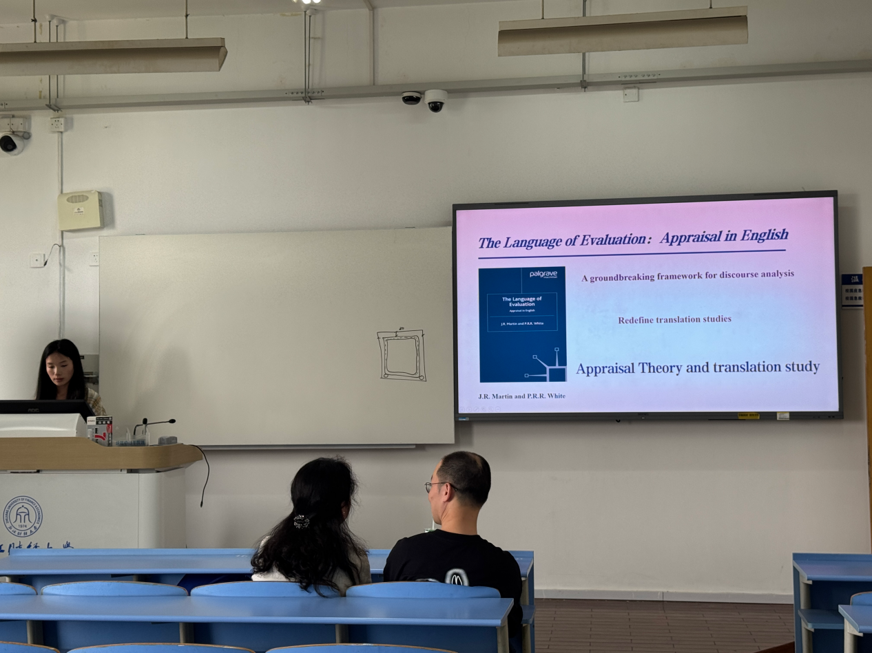 孙亚林同学作了主题为“Appraisal Theory and translation study”的读书报告。该读书报告以“评价理论与翻译研究”为主题,详细介绍了评价理论的框架和核心内容,以及评价理论的具体应用。评价理论为翻译学提供了的新视角并在翻译研究中得到了具体的应用。